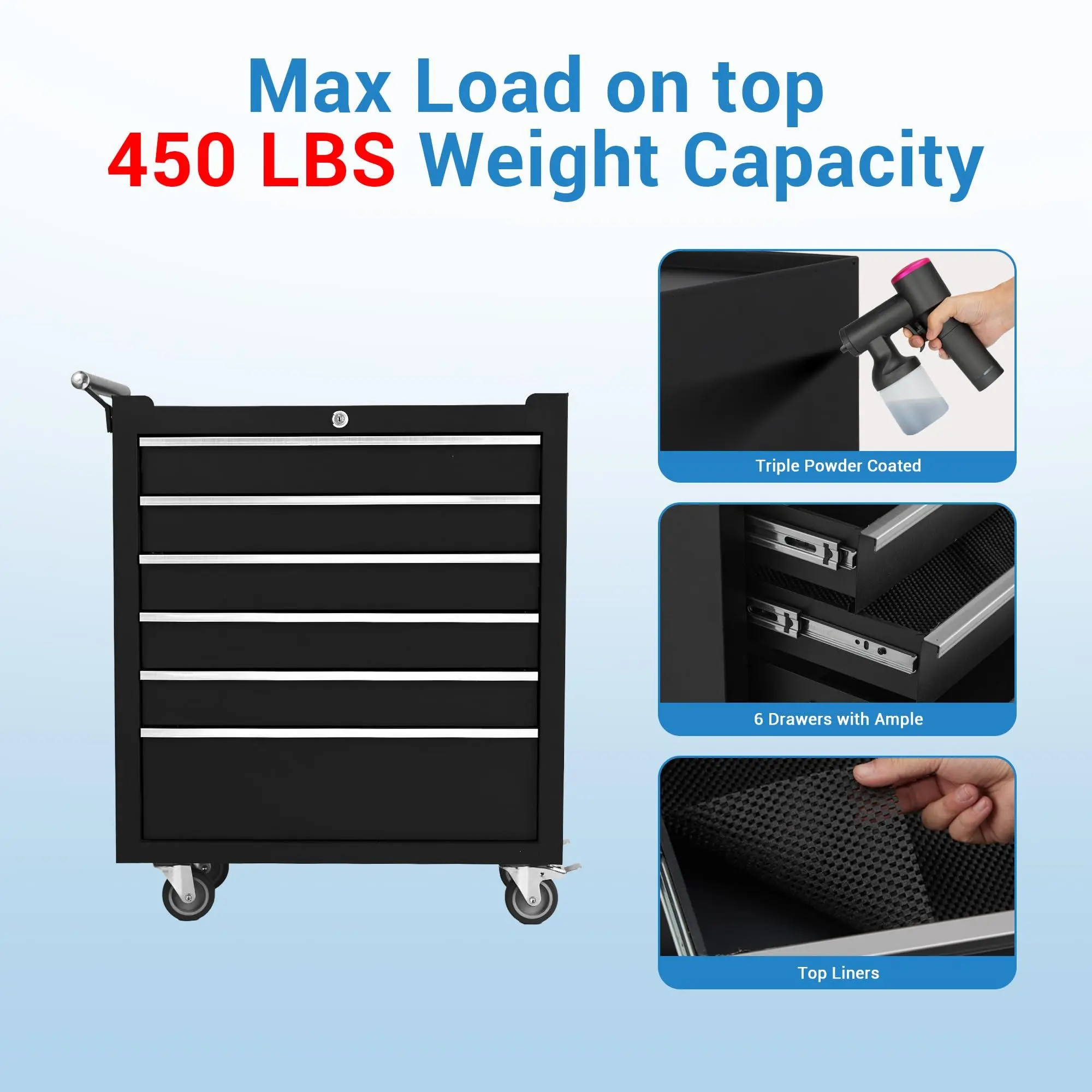 【Durable Steel Construction】 Constructed from high-quality steel with a powder-coated finish, this 24-inch rolling tool chest with 6-drawers offers long-lasting durability and a smooth, easy-to-clean surface that maintains its appearance over time.