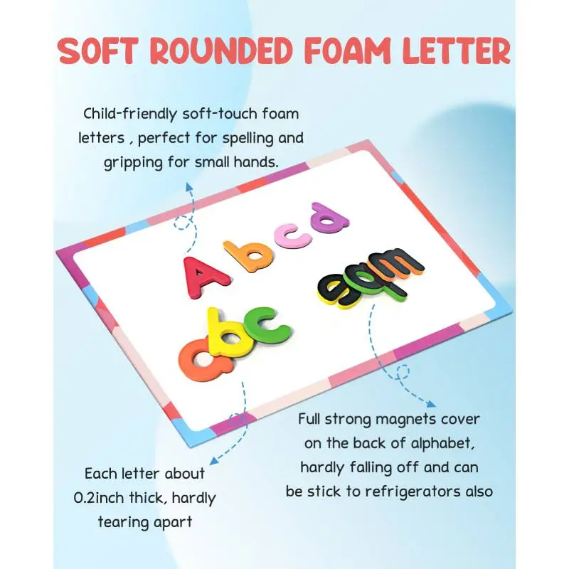 ·Good-quality Materials: All letters are made of soft-touch EVA foam. Each letter size is about 1.2 inches with a full-cover magnet on the back, with no loose magnet bits. They can be attached to the refrigerator, dishwasher, or our magnetic drawing board without falling off. The texture is very soft, it's suitable for children's hands, perfect for gripping and spelling. They can be washable.