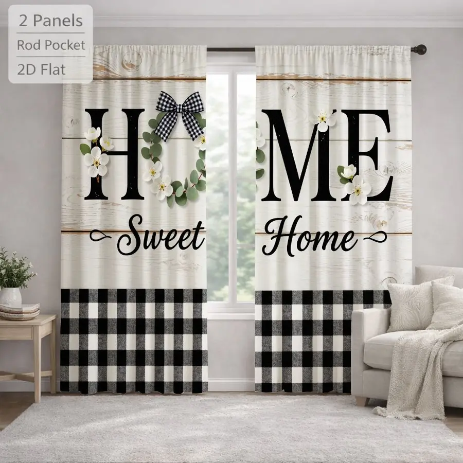 2Pcs Rustic Plaid Farmhouse Letter Print Sun Blocking Curtains Digital Printed Rod Pocket, Window Treatment For Bedroom Office Kitchen Living Room Study Home Decor