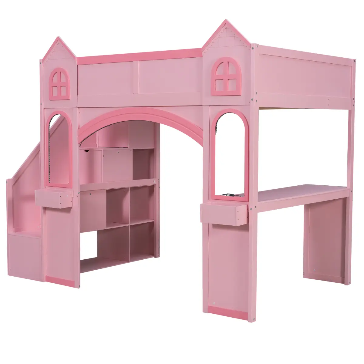 Full Size Wood Castle Loft Bed with Storage Staircase, Desk, Windows, Shelves and LED Light, Pink