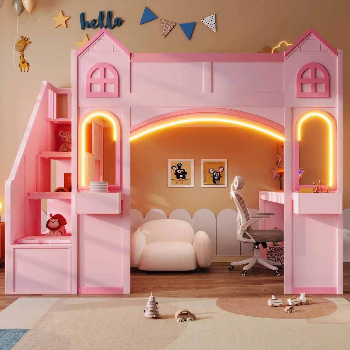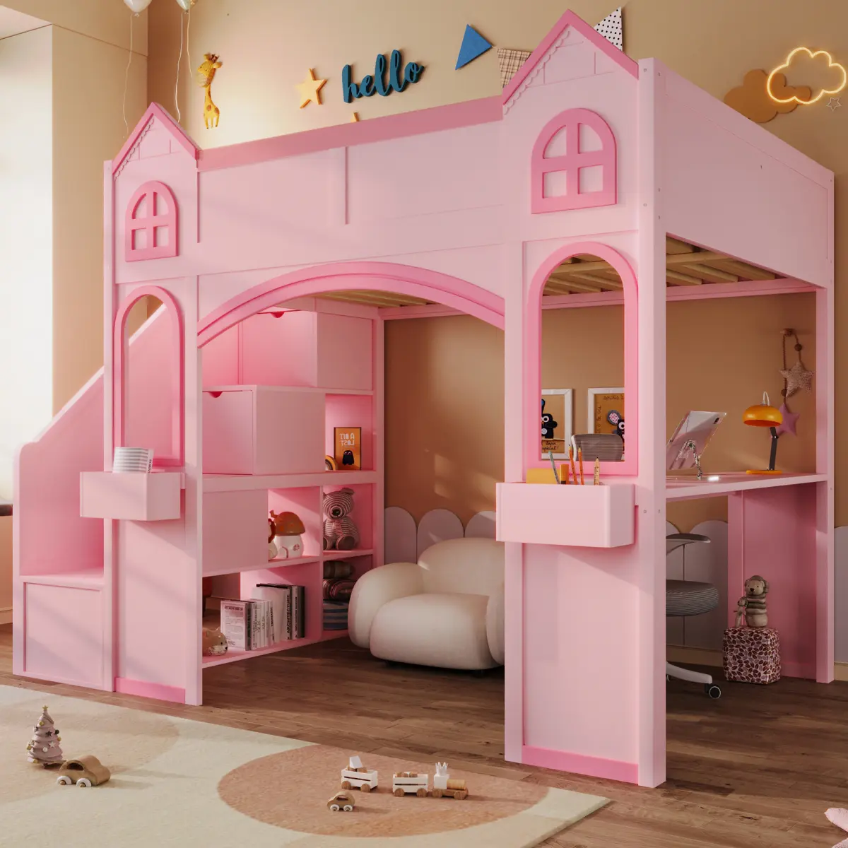 Transform your child's room with this enchanting princess castle bed, a magical sleep and play space designed to inspire imaginative adventures.This bed with a desk offers an integrated study area and whiteboard, creating the perfect zone for homework and creative projects.The sturdy staircase ensures safe access and reveals a practical bunk bed with storage, featuring integrated shelving for books and toys.Finished with non-toxic paint and a gentle LED light, this children's loft bed ensures a safe and cosy environment for rest and play.