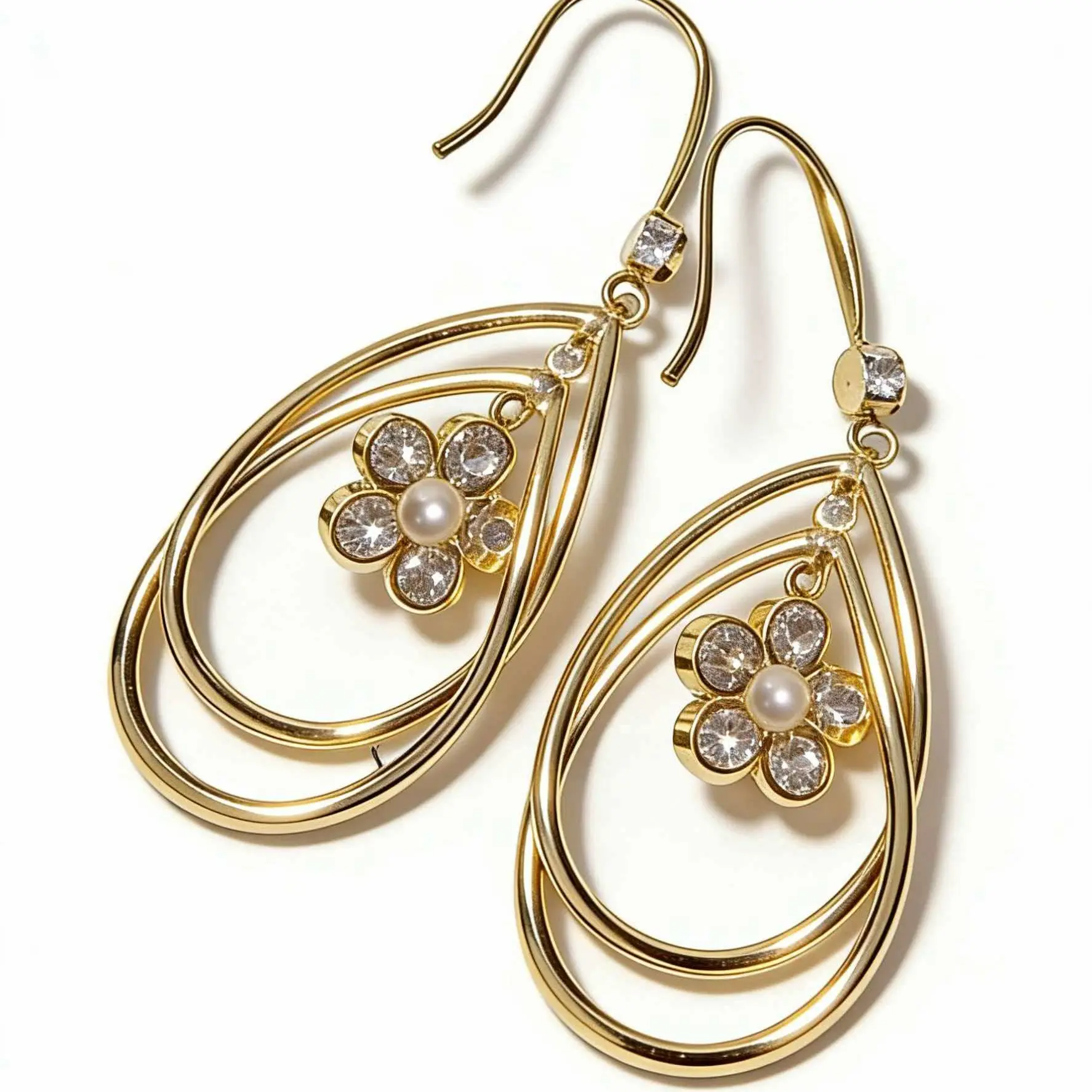Crafted with a luminous gold-tone finish, each earring features a graceful layered teardrop silhouette, artfully framed by three flowing, curved metal lines that catch the light with every movement. At the heart of the design blooms a delicate floral motif, centered by a lustrous pearl-like accent and surrounded by sparkling stones, adding a subtle, radiant glow that elevates the piece from simple to stunning. A single sparkling stone at the hook completes the refined, cohesive design, ensuring a polished finish from every angle.