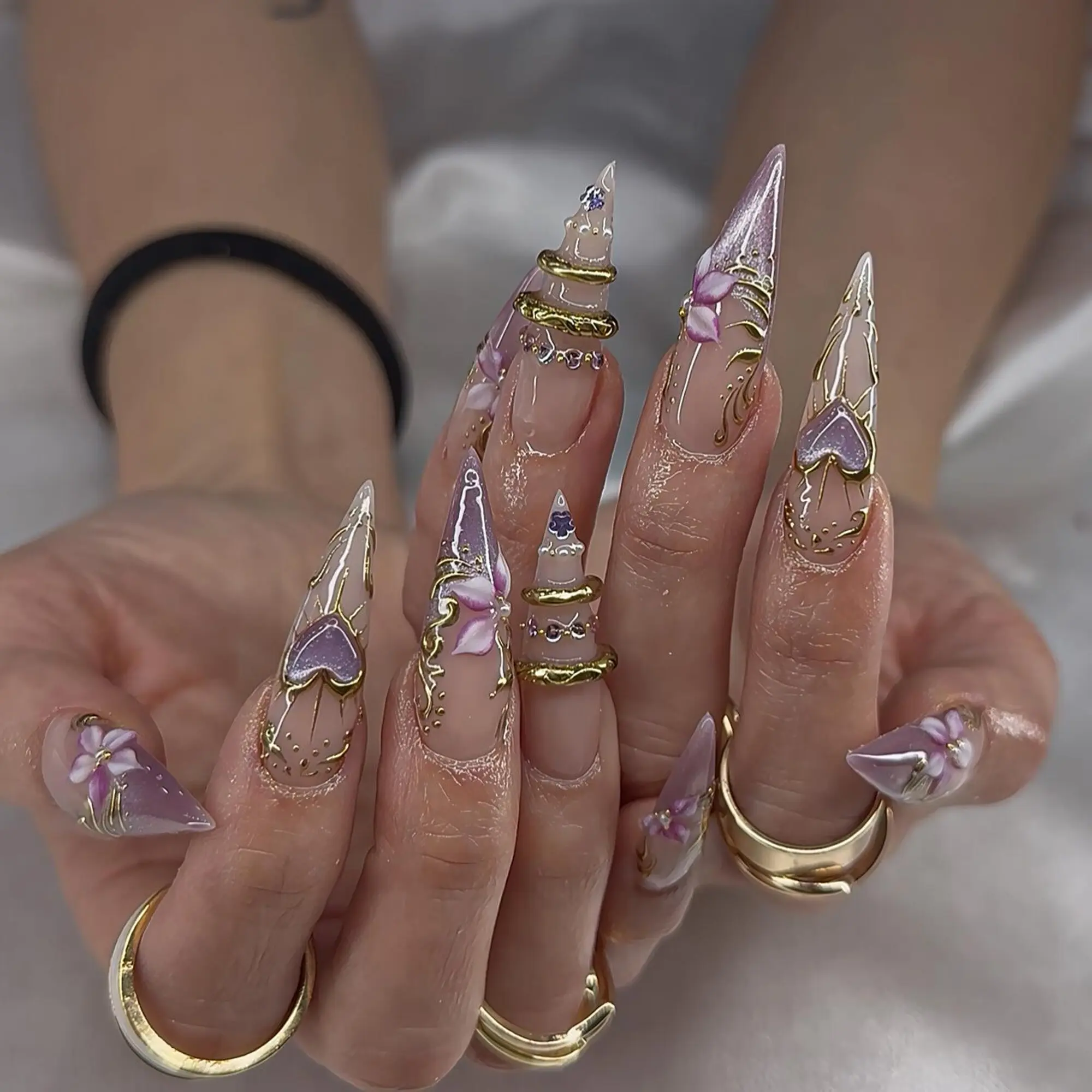 Luxury 3D Gold Filigree Press On Nails, Purple Floral Stiletto Nails,  Elegant Victorian Aesthetic Fake Nails, Handmade Reusable Nails E7YWZY