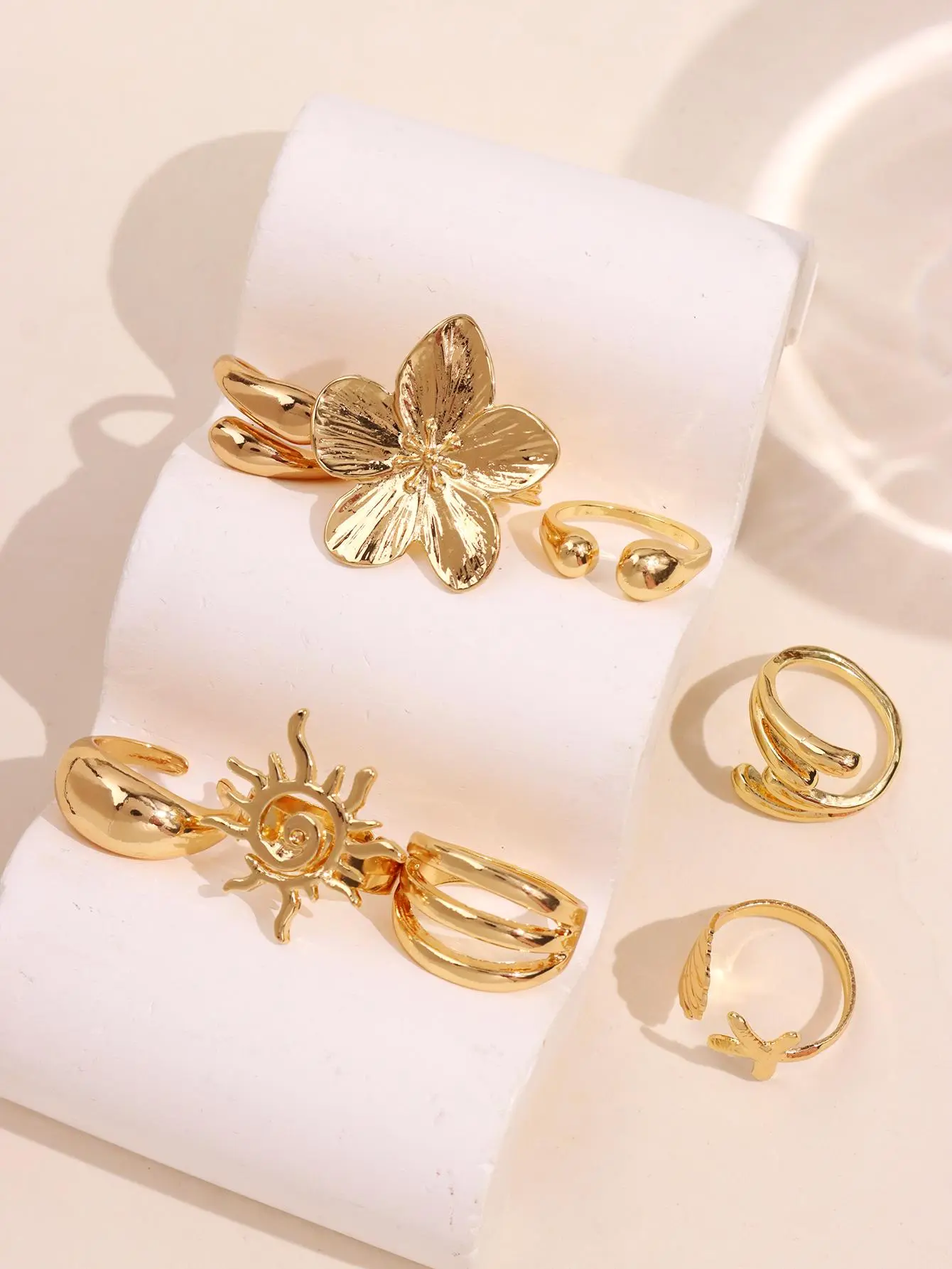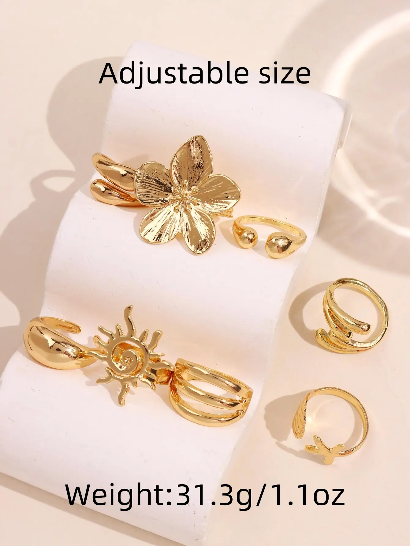8-piece set: fashionable, bold, unique, high-end, elegant, refined, sparkling, chic, versatile, luxurious jewelry set featuring sunflower and seashell motifs with irregular geometric cutout designs—rings for women’s everyday wear, holiday parties, and sum