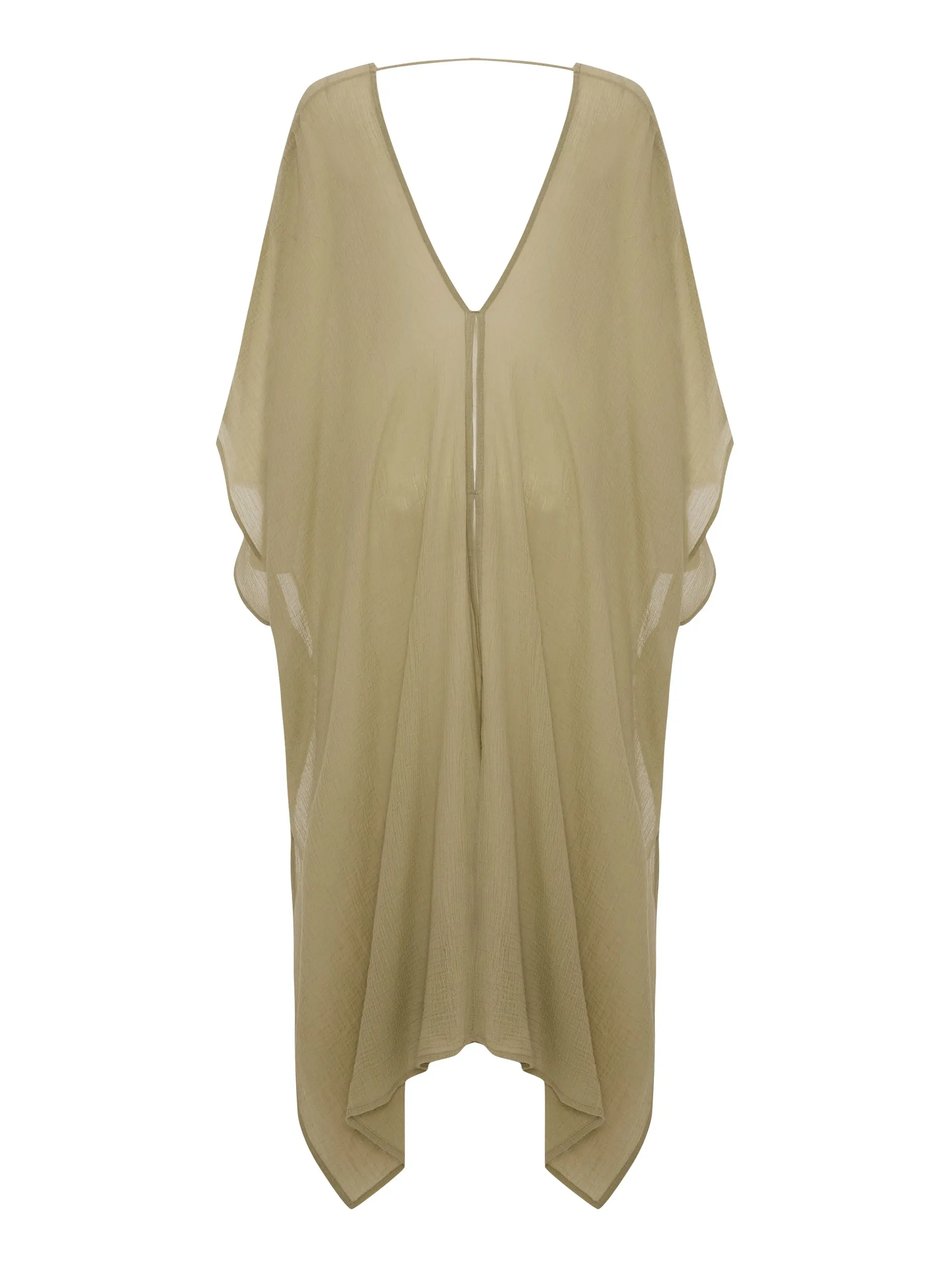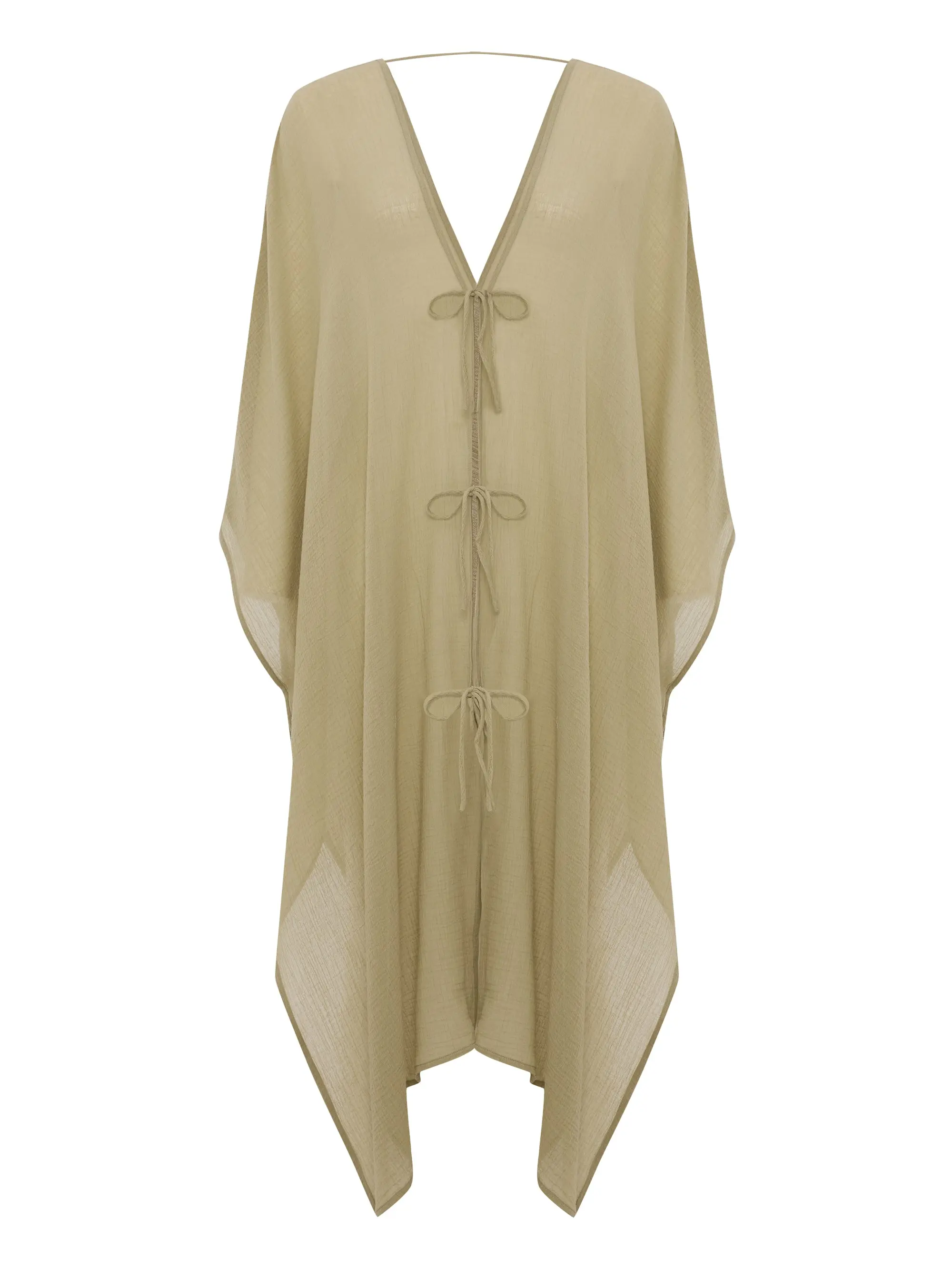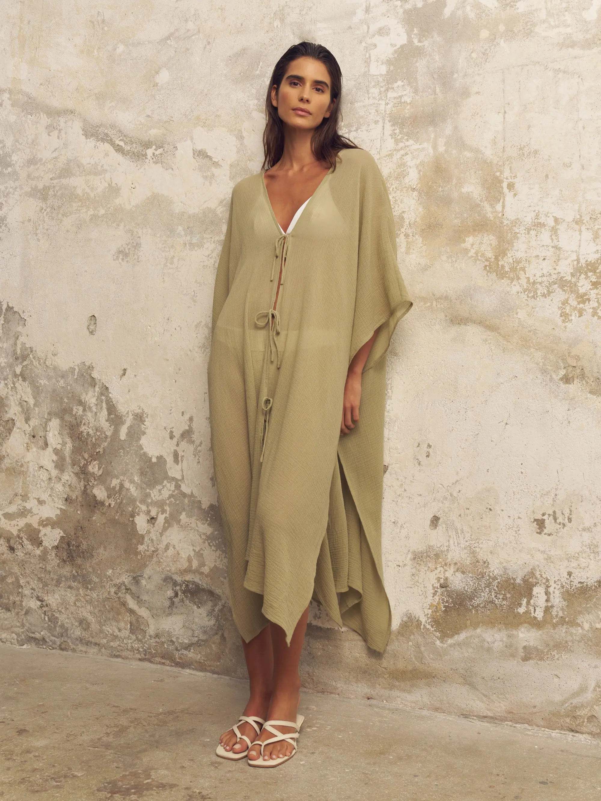 This kaftan features an ethereal, see-through design that drapes effortlessly over the body. Its delicate, ultra-flowy fabric offers a luxurious feel, perfect for breezy beach days or relaxed resort styling. Designed with a deep V-neckline, front tie closures, and an elegant open back with a subtle strap detail, it adds an air of understated sophistication. A truly special piece that embodies effortless elegance and versatility.