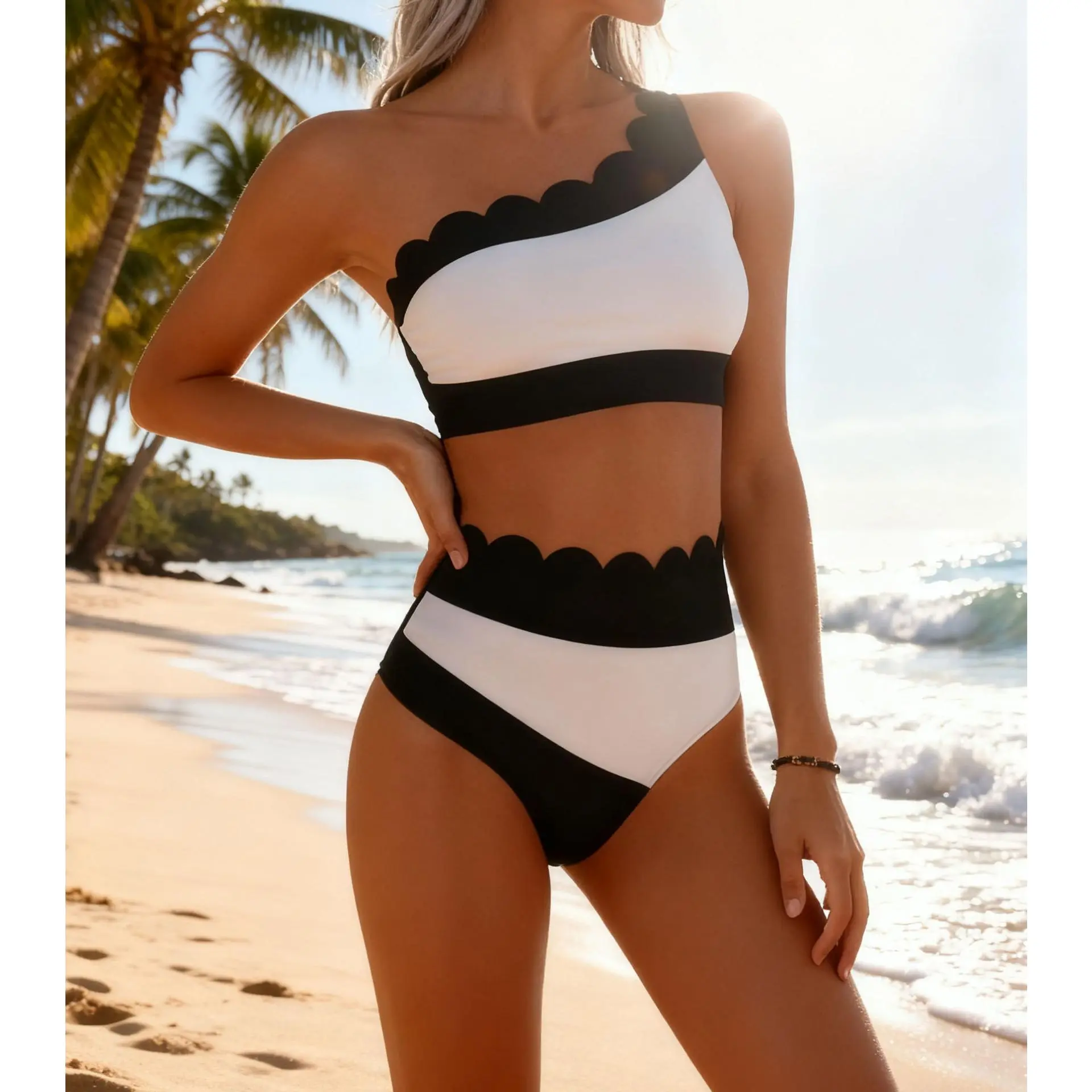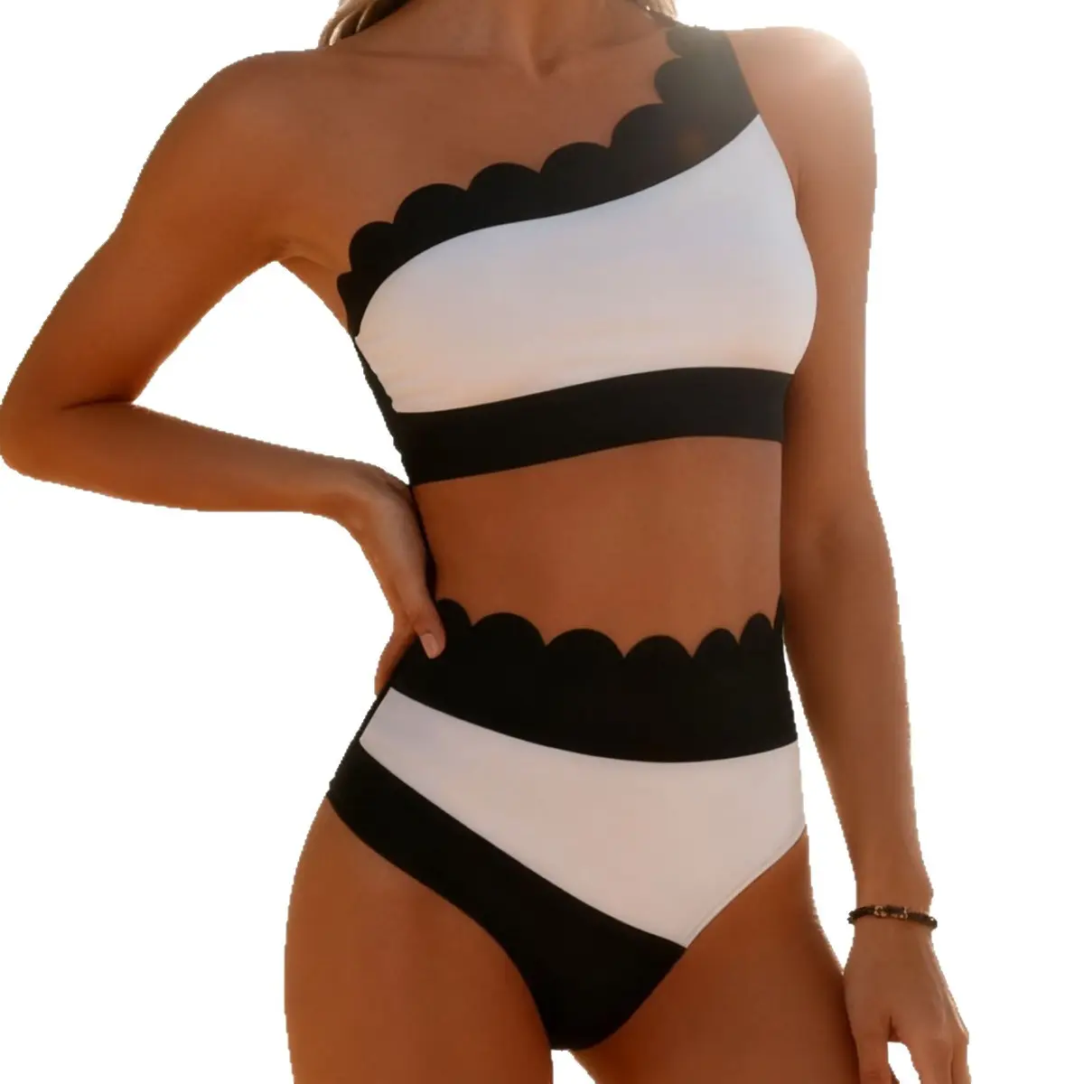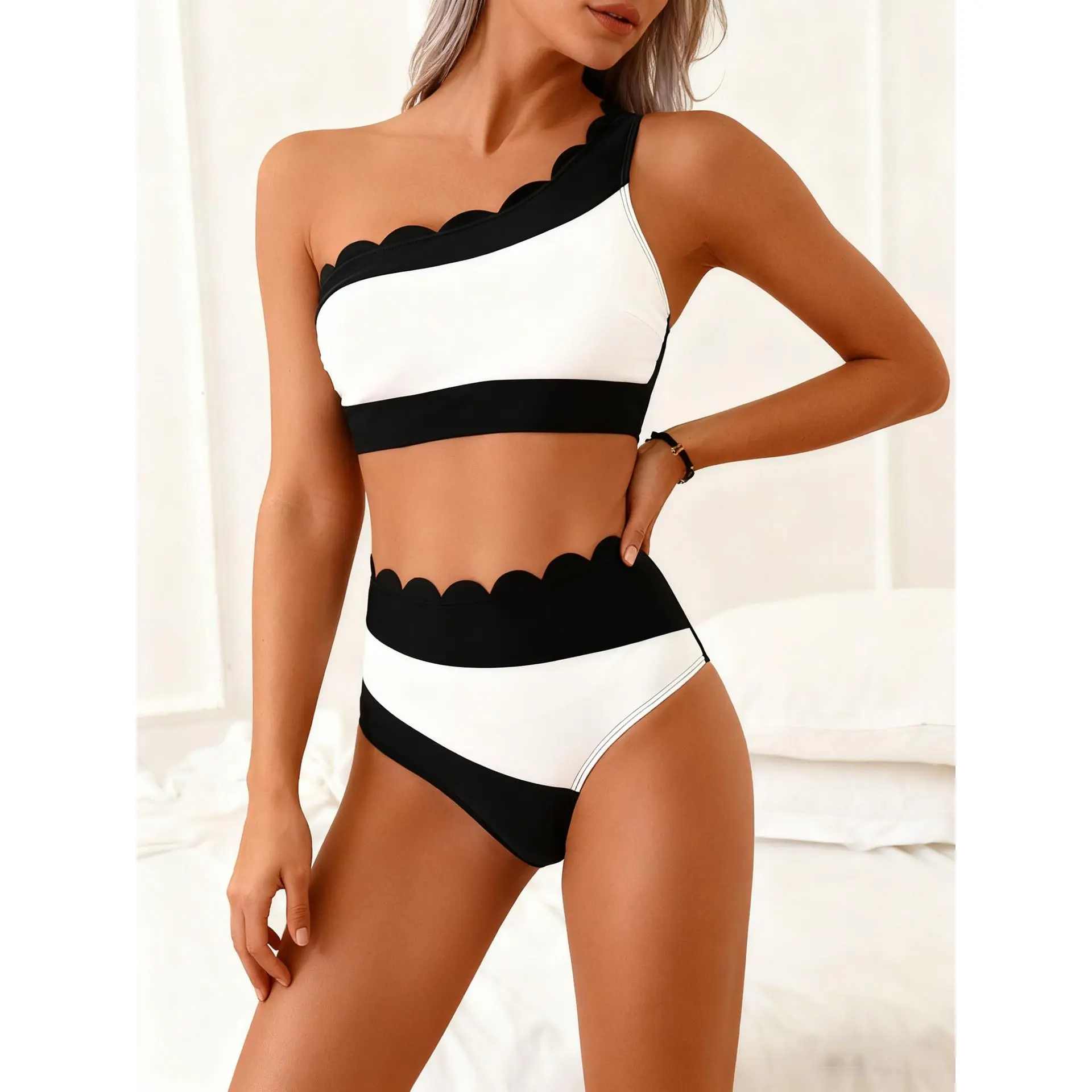 Design: Our one-shoulder asymmetrical wave-neckline bikini set is sure to make you the center of attention. This elegant two-piece swimsuit features a mid-rise wave-patterned bottom that flatters your figure. Cup Style: Comes with soft, removable pads.