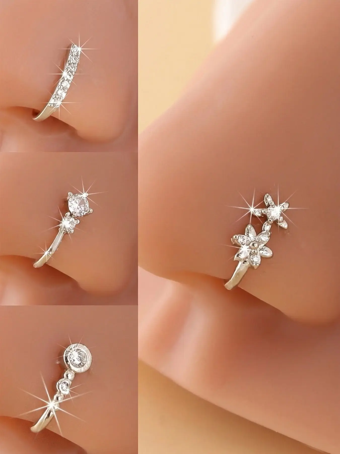 4-Pack Easy Flower Nose Clips, Synthetic Zirconia Inlay, Fake Piercing-Free Nose Jewelry, Fashionable Daily Wear Nose Rings