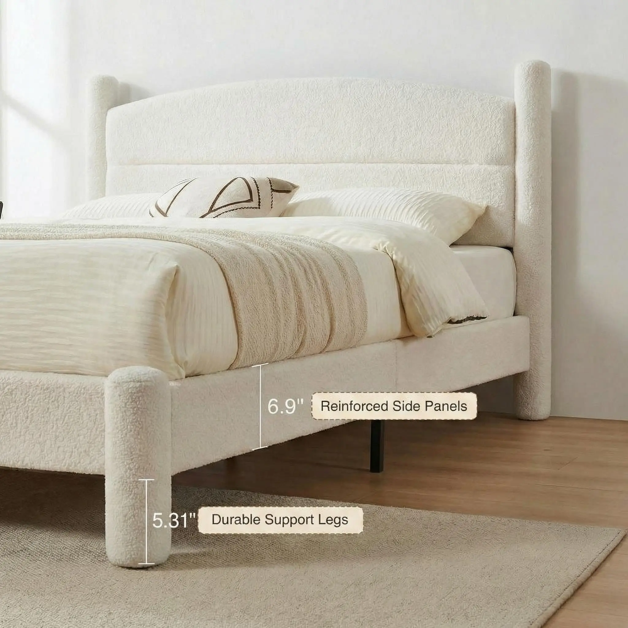 ·Luxurious & Cloud-Kissed Boucle Upholstery: Experience top-tier comfort with premium boucle fabric that clads the entire bed frame. This on-trend, tactile material is incredibly soft to the touch while staying nicely breathable, wrapping you in that coveted cozy, cloud-like ease. No matter the season, it can infuse your space with a consistent sense of comfort.