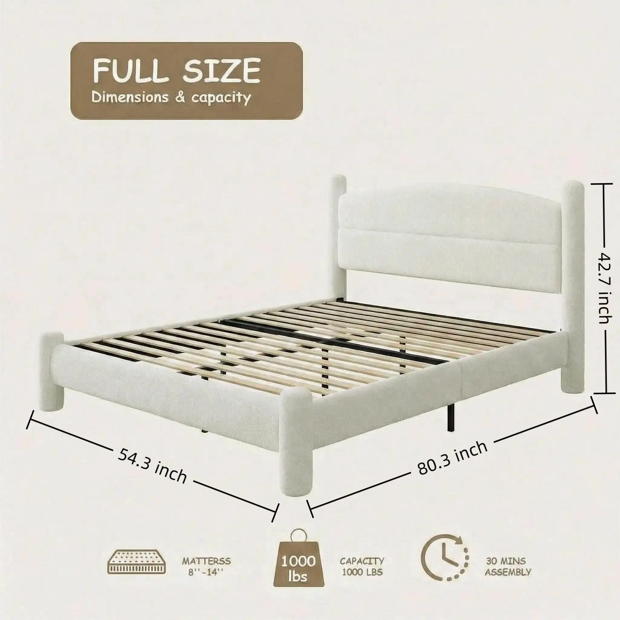 ·Cozy & Whimsical Warm Vibe: Centered on a soft milk-white shade that lays a gentle, welcoming foundation, it features a rounded headboard & cylindrical bed legs, paired with the plush, inviting texture of BOUCLE upholstery—this combo cranks up that "cloud-like, comforting feel." It can blend perfectly into various bedroom styles, wrapping the space in an inviting, laid-back coziness.