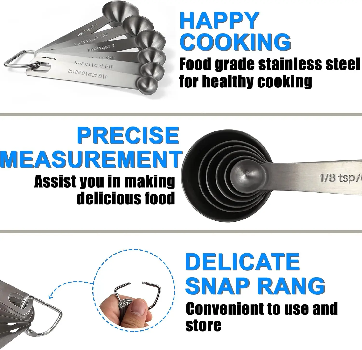 ·WELL-DESIGNED 6pc SET: Innovative round scoops fit nicely in seasoning jars and other small containers without spilling. 6pc sets included 1/8 teaspoon, 1/4 teaspoon, 1/2 teaspoon, 1 teaspoon, 1/ 2 tbsp, 1 tbsp, attached with D-ring helps keep all spoons together during cooking or baking. Measurements of each spoon are engraved on handle, never lose track of adding spices to your dishes