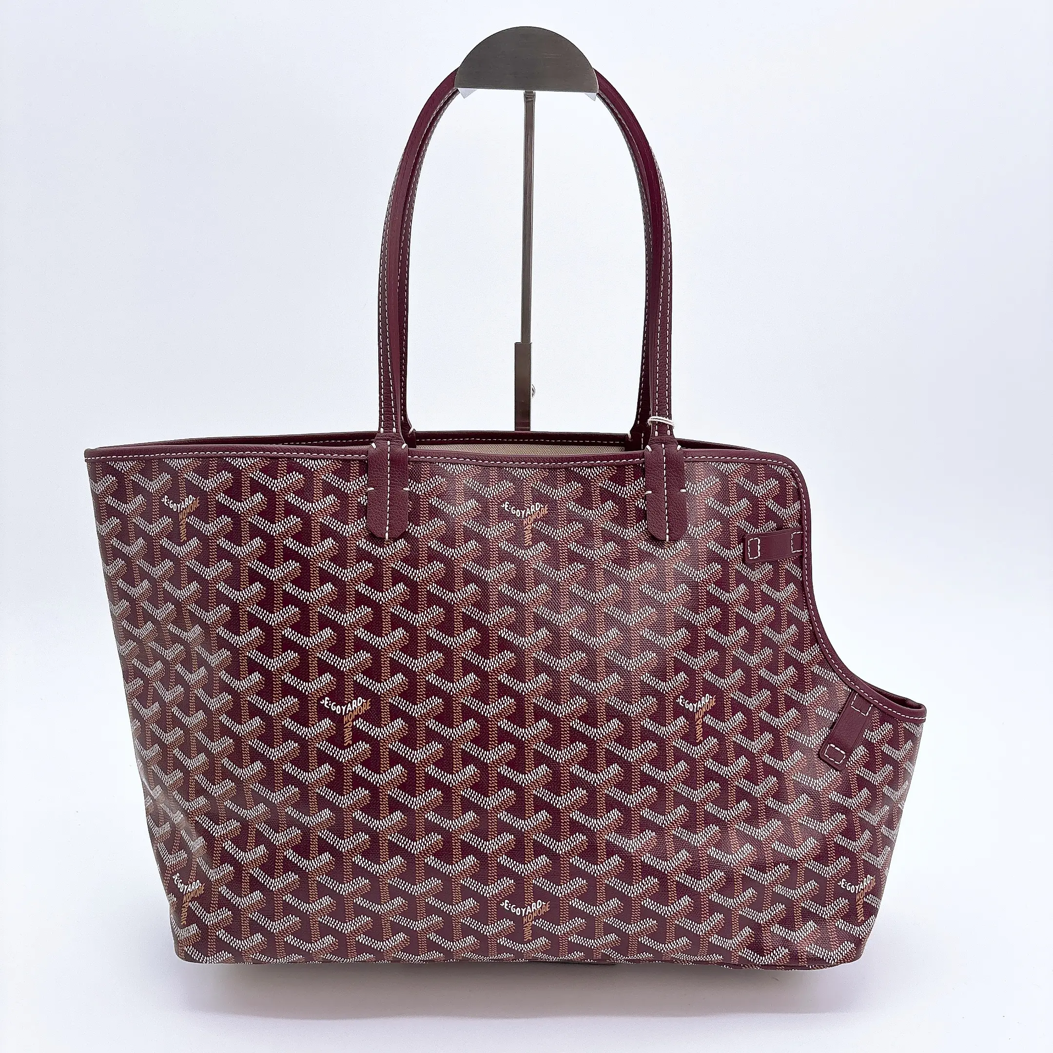 This is an authentic GGOYARD Goyardine Chien Gris Bag in Burgundy. This luxurious pet-friendly bag is crafted of Goyard monogram on toile canvas. The bag features thin leather top handles and leather trim around the opening of the bag. This top opens to an ivory textile interior with a removable beige base for easy cleaning. The bag features one open end with an adjustable buckle strap to secure the top for the proper opening for your pet.