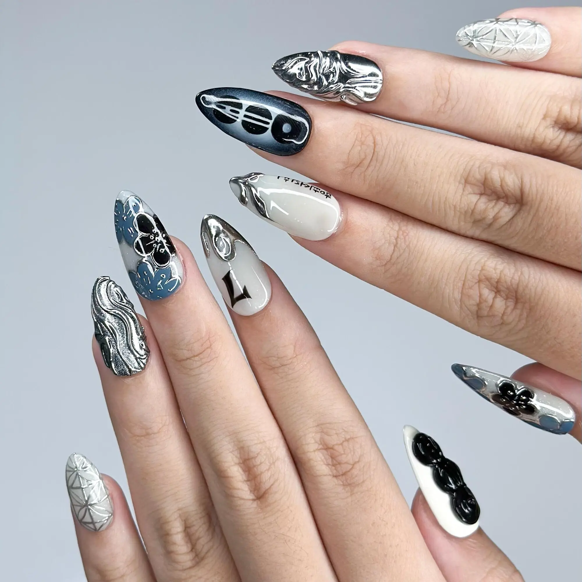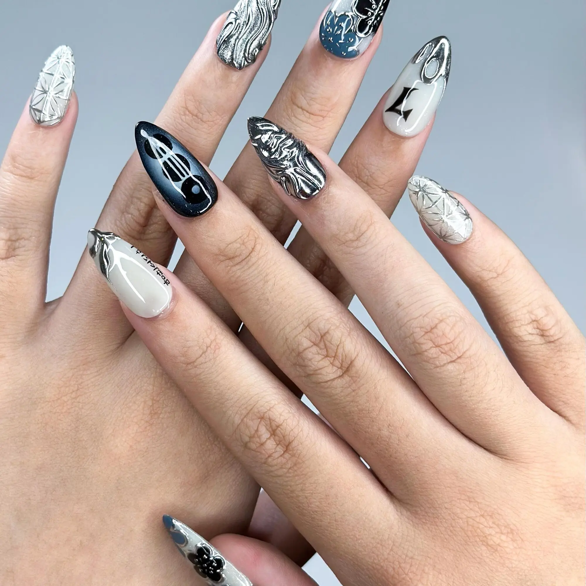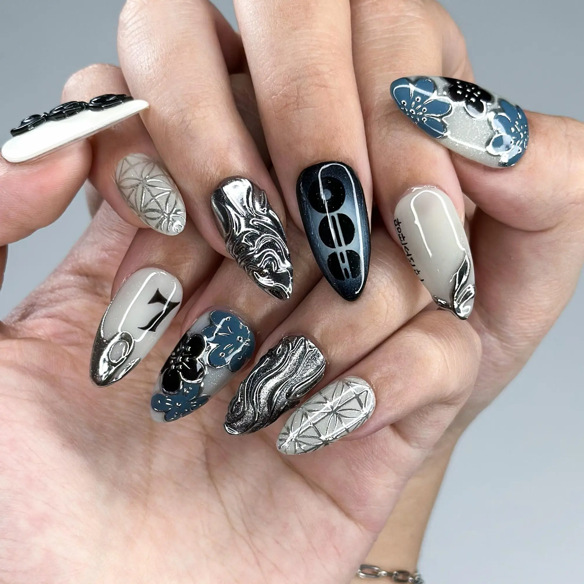Kpop Inspired Indigo Voyage Nails | 7 Spirit Arirang Silver Shark Nails | Ocean Muse 3D Chrome Nails |Handmade Fandom Concert Nails|HC1321IC FKDMGB