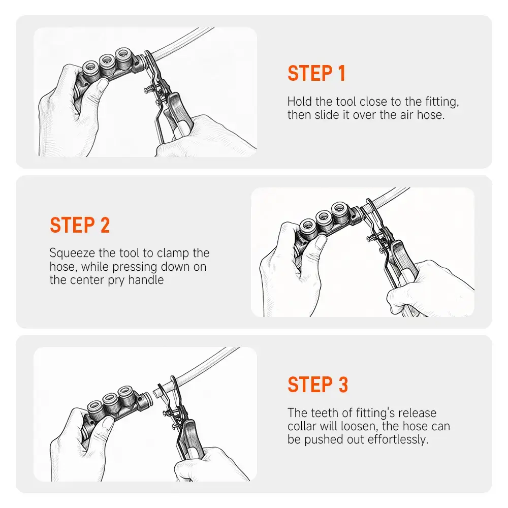 ·EASY TO USE: Position the push to connect removal tool next to the fitting with the lever in the middle. Squeeze the tongs to grip the air pipe and keep it clamped, depress the middle lever with your thumb or other fingers to release the locking collar. The tube will be effortlessly pushed out.