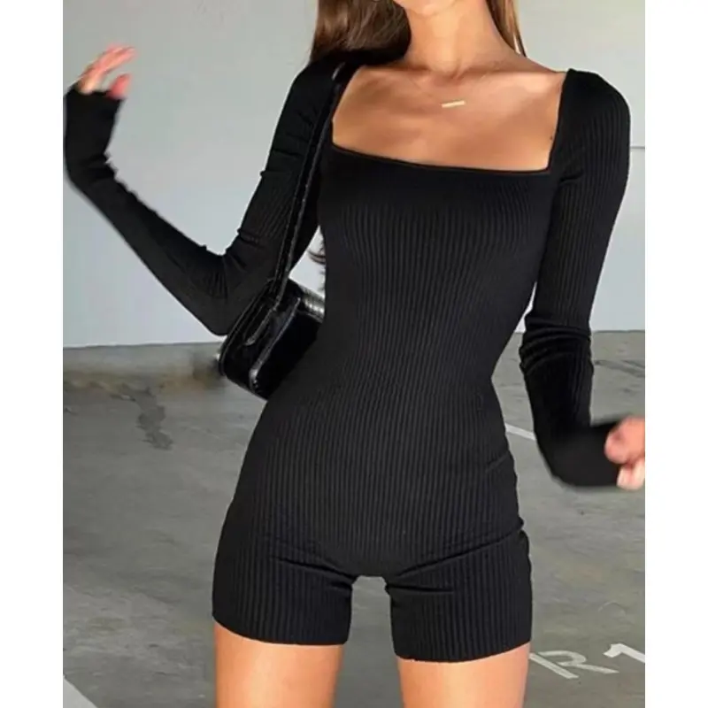 Womens Long Sleeve Workout Jumpsuit Square Neck Ribbed Seamless Yoga Romper Sexy Bodycon Tummy Control Unitard Onesie