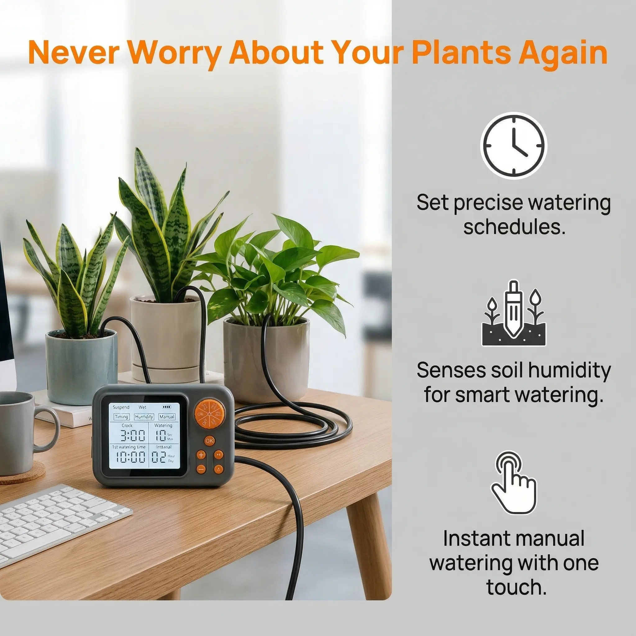 ·Automatic plant watering system: Once programmed, it automatically provides your plants with precise hydration and keeps your garden lush and vibrant. Enjoy worry-free travel and precious happy moments with your loved ones