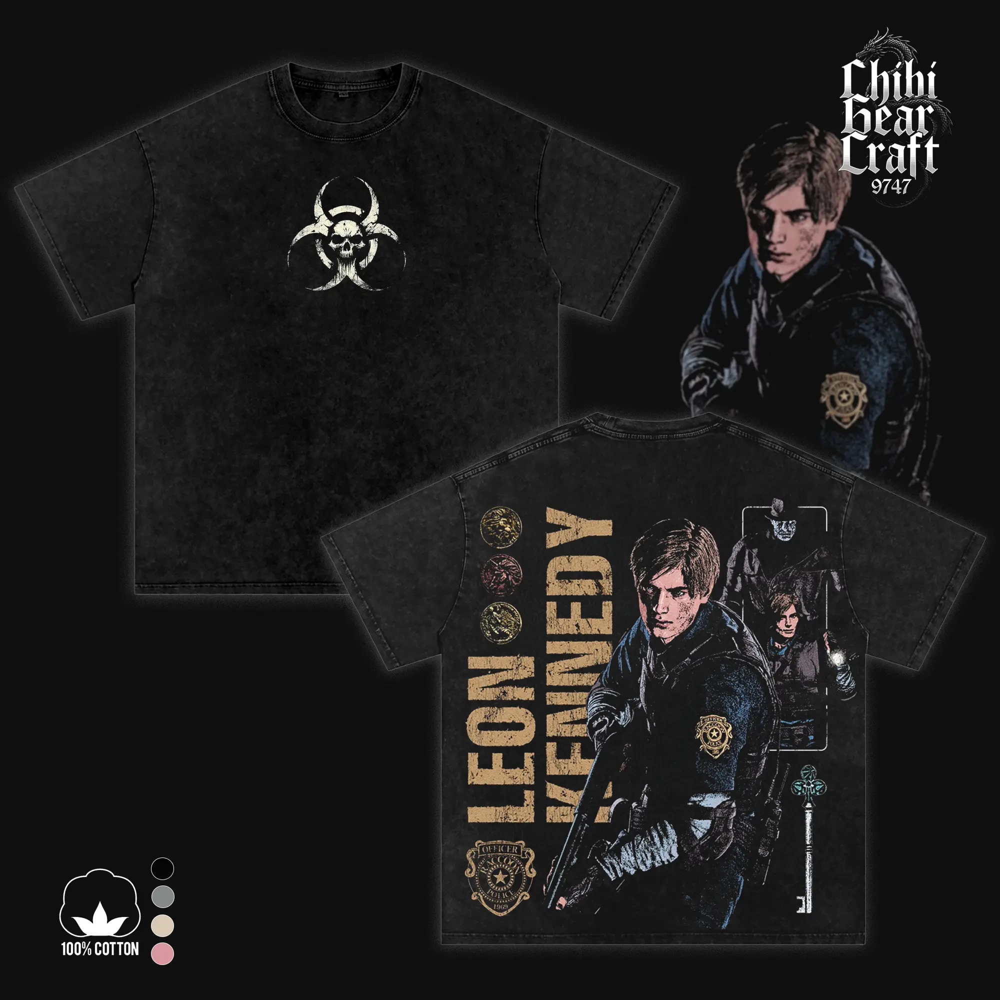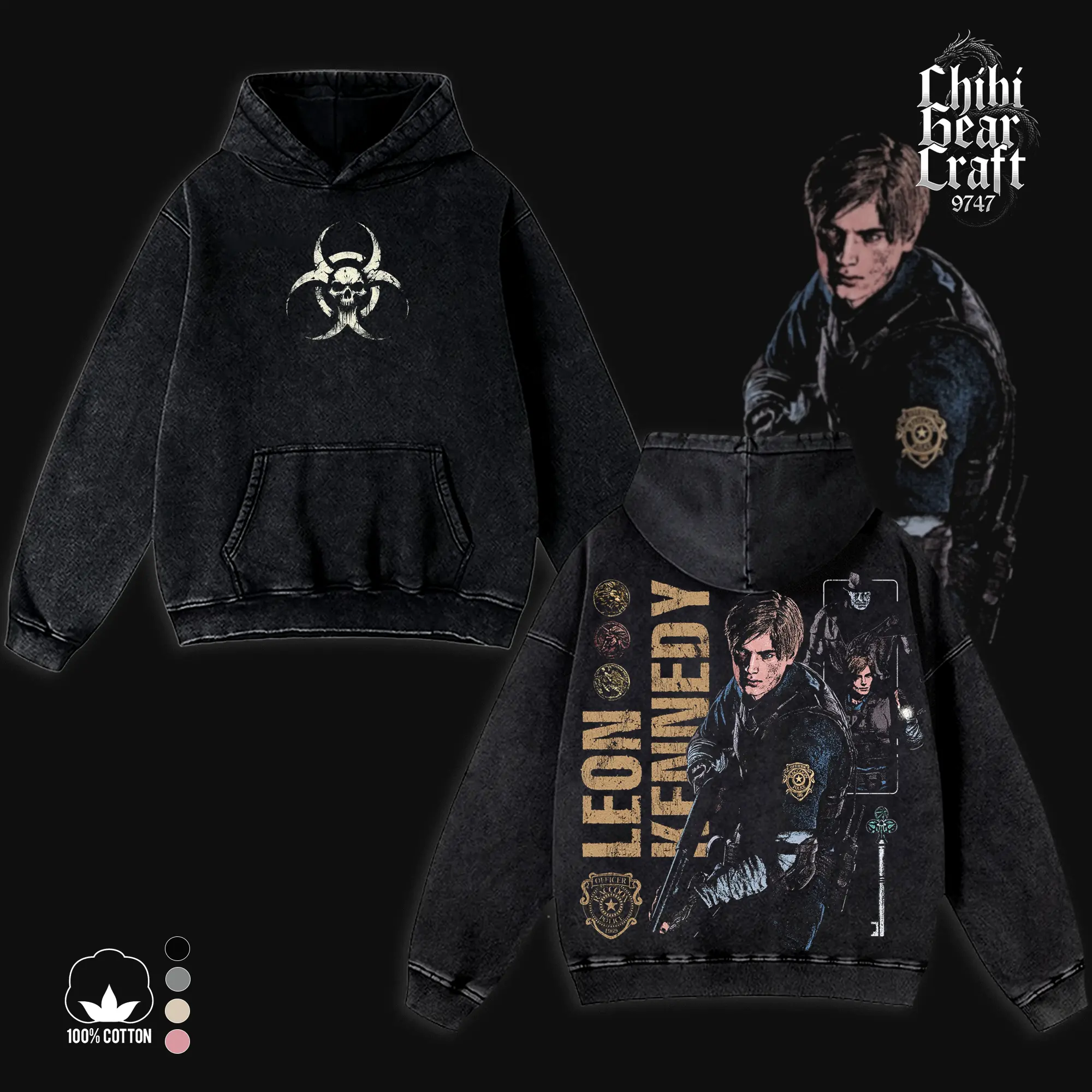 5. Resident Evil 2 Remake Leon Kennedy Vintage Washed Hoodie, Biohazard Skull Graphic Oversized Sweatshirt, Raccoon City Police Dept Merch, Premium Cotton Unisex Game Tee