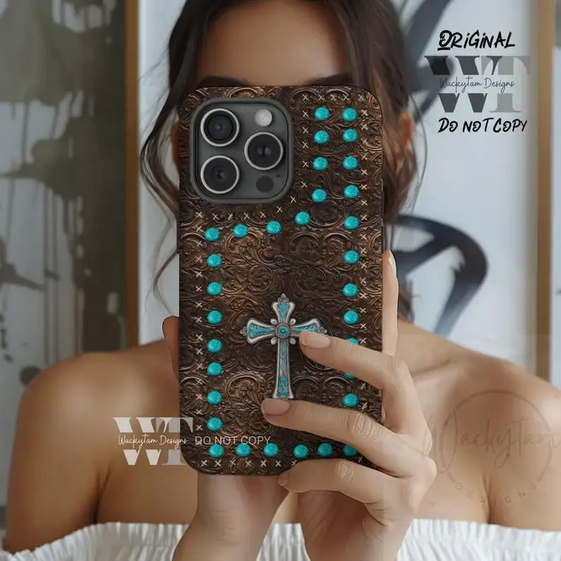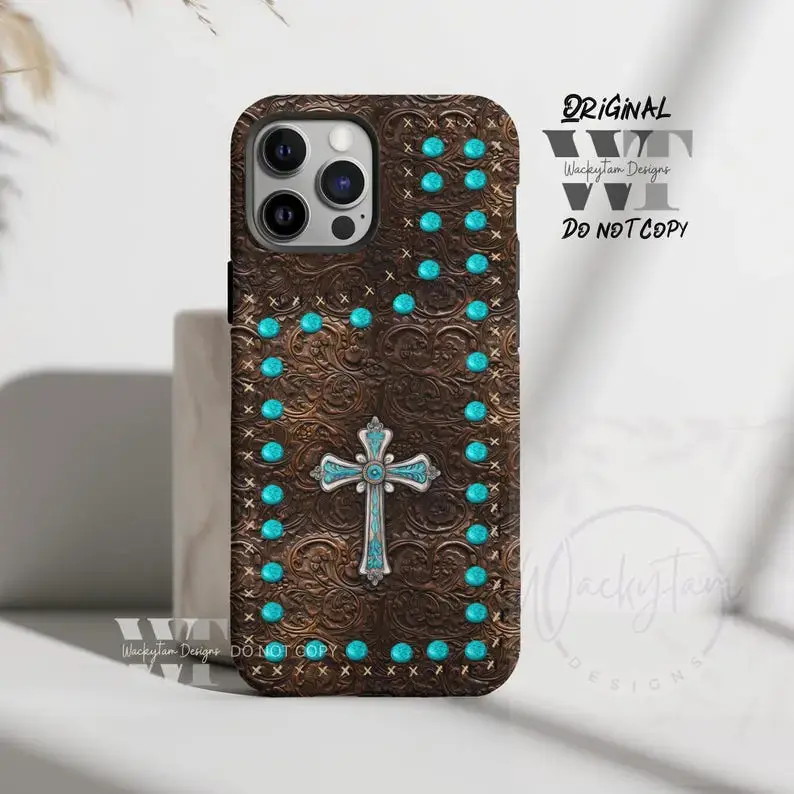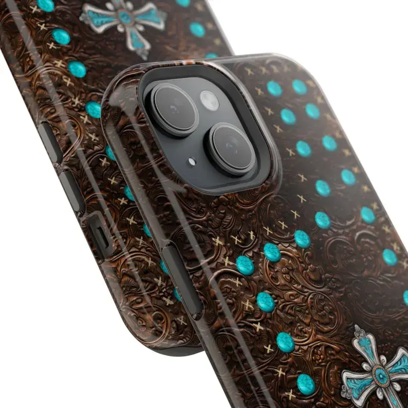 5. Faith Cross Phone Case – Durable Western Christian Cover, Artistic Turquoise Design, Magnetic iPhone 17 16 15 14 13 12 11