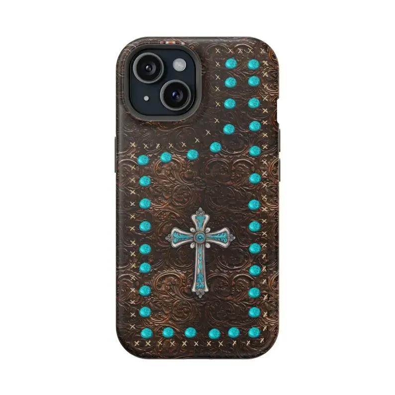 Faith Cross Phone Case – Durable Western Christian Cover, Artistic Turquoise Design, Magnetic iPhone 17 16 15 14 13 12 11