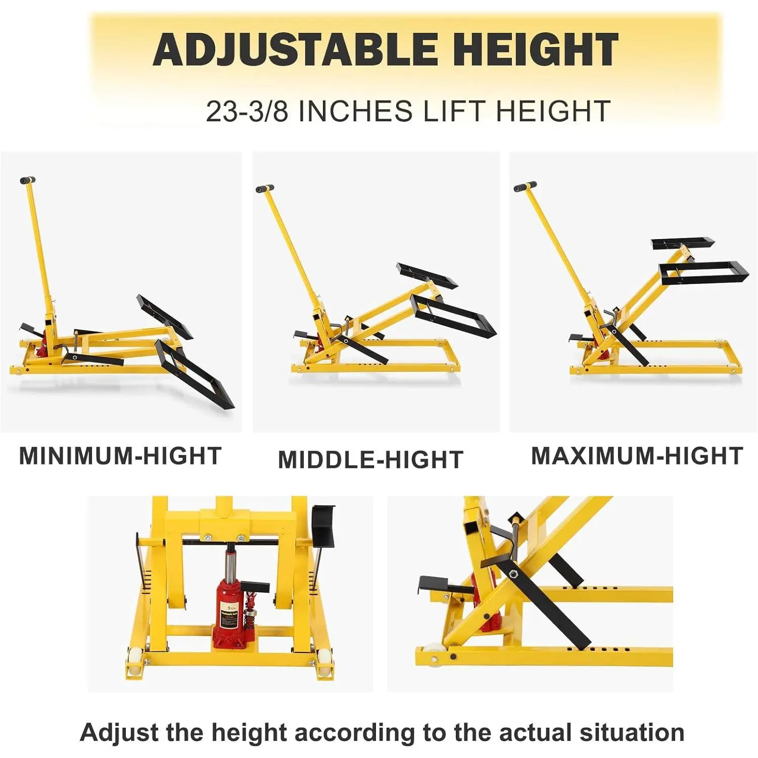 ·Compact and Portable: Lightweight and easy to store, our lawn tractor lift jack is designed for effortless transport and storage, ensuring you can maintain your equipment whenever and wherever needed.