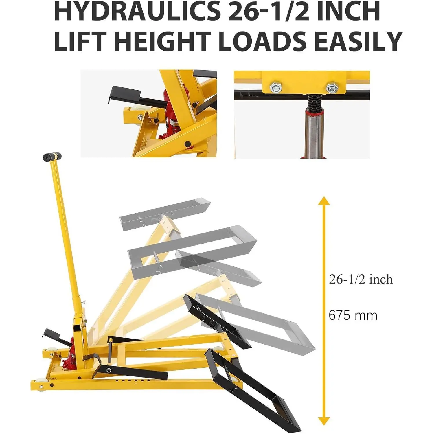 ·Hydraulic Lift Power: Effortlessly lift your lawn mower or garden tractor with our hydraulic lift jack, featuring a remarkable 26-1/2 inch lift height and a robust 500lb lifting capacity for convenience and safety during maintenance tasks.