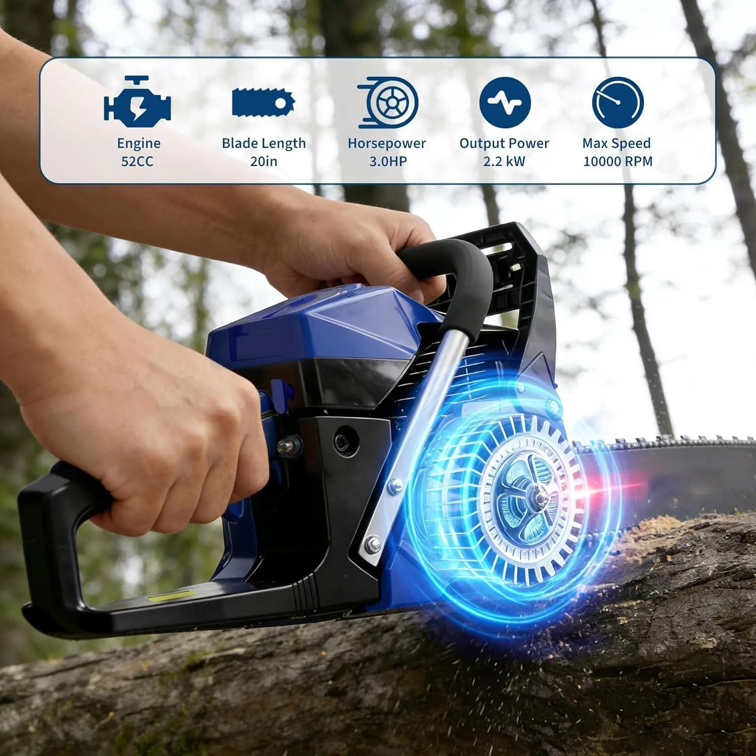 【52CC Two-Stroke Powerhouse, Efficiently Cuts All Types of Wood】This gas-powered chainsaw features a 52CC two-stroke engine delivering 3.0 horsepower and a maximum speed of 10,000 RPM, effortlessly handling heavy-duty tasks. Equipped with a 20-inch guide bar, it efficiently cuts logs, thick branches, and firewood up to 20 inches in diameter, providing a powerful and smooth cutting experience with outstanding performance on all types of wood.