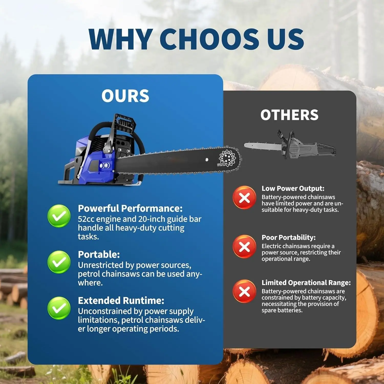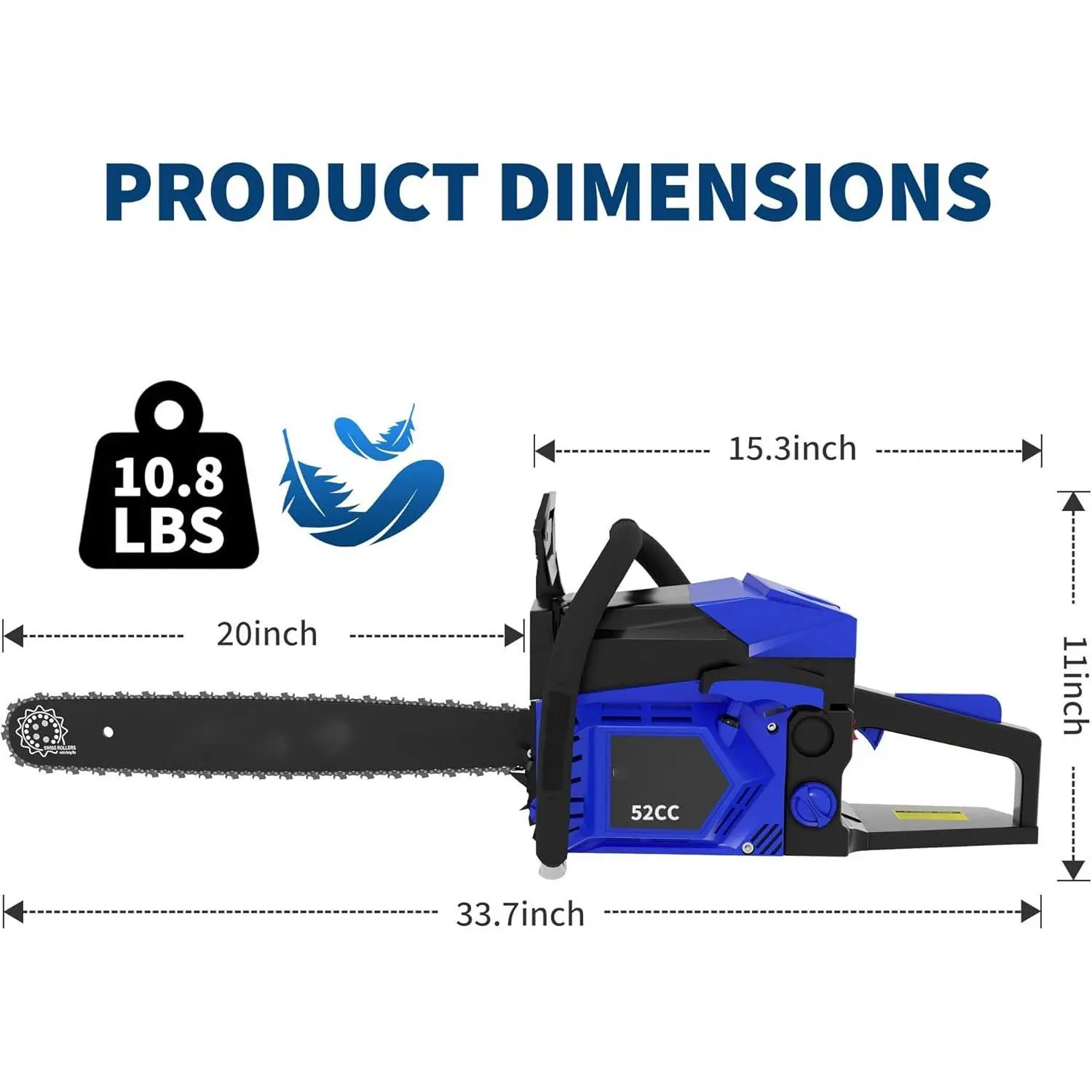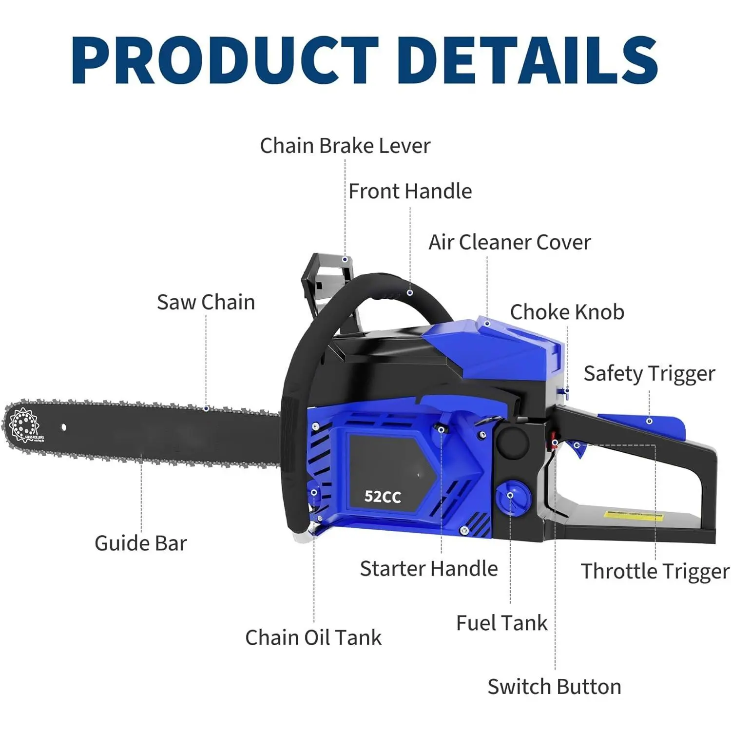 【Dual Safety Protection System for Peace of Mind During Operation】The 20-inch chainsaw integrates a quick-stop chain brake that instantly halts the chain in emergencies. Paired with a safety switch lock to prevent accidental start-up and reinforced front guard, it builds multi-layered safety barriers to safeguard users throughout operation.
