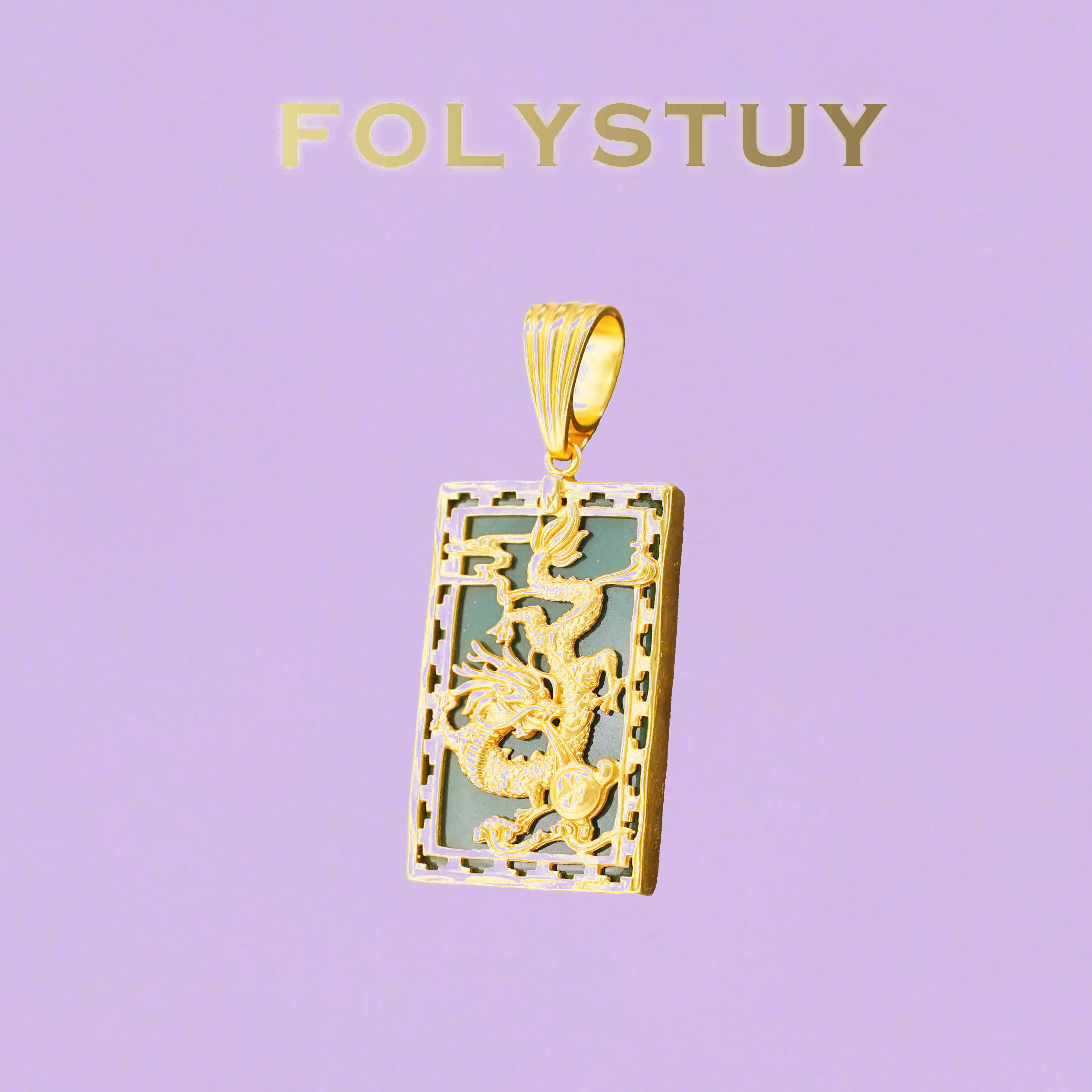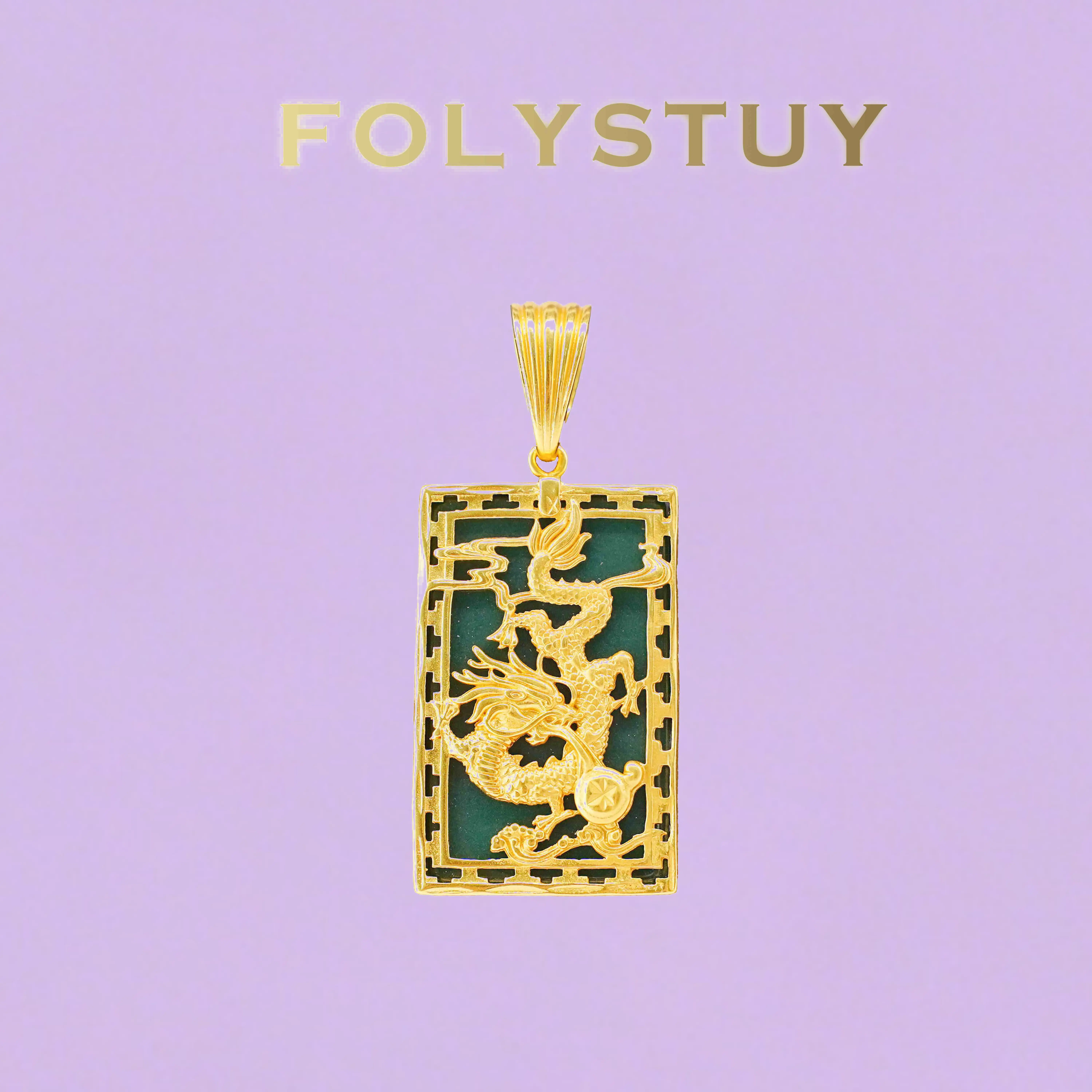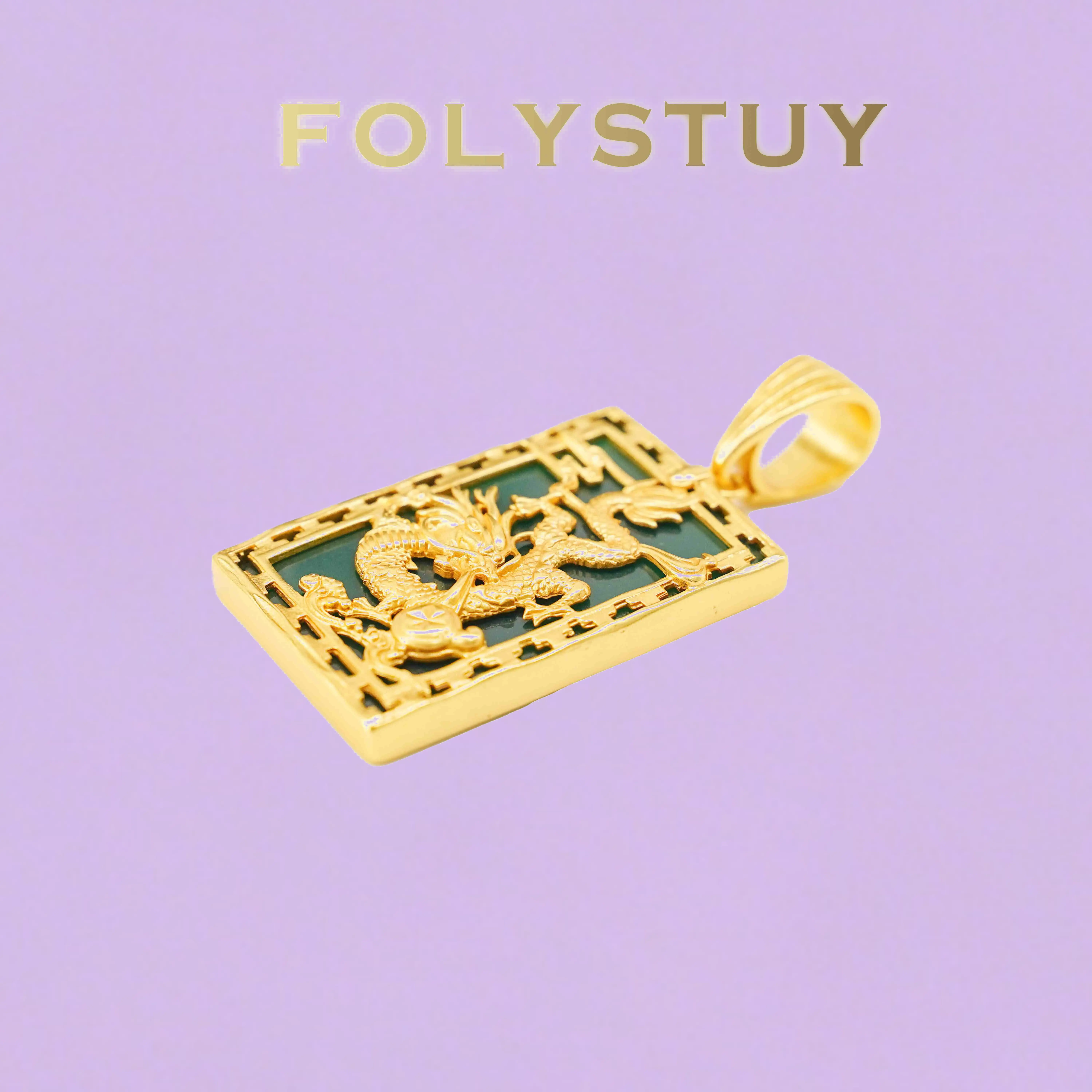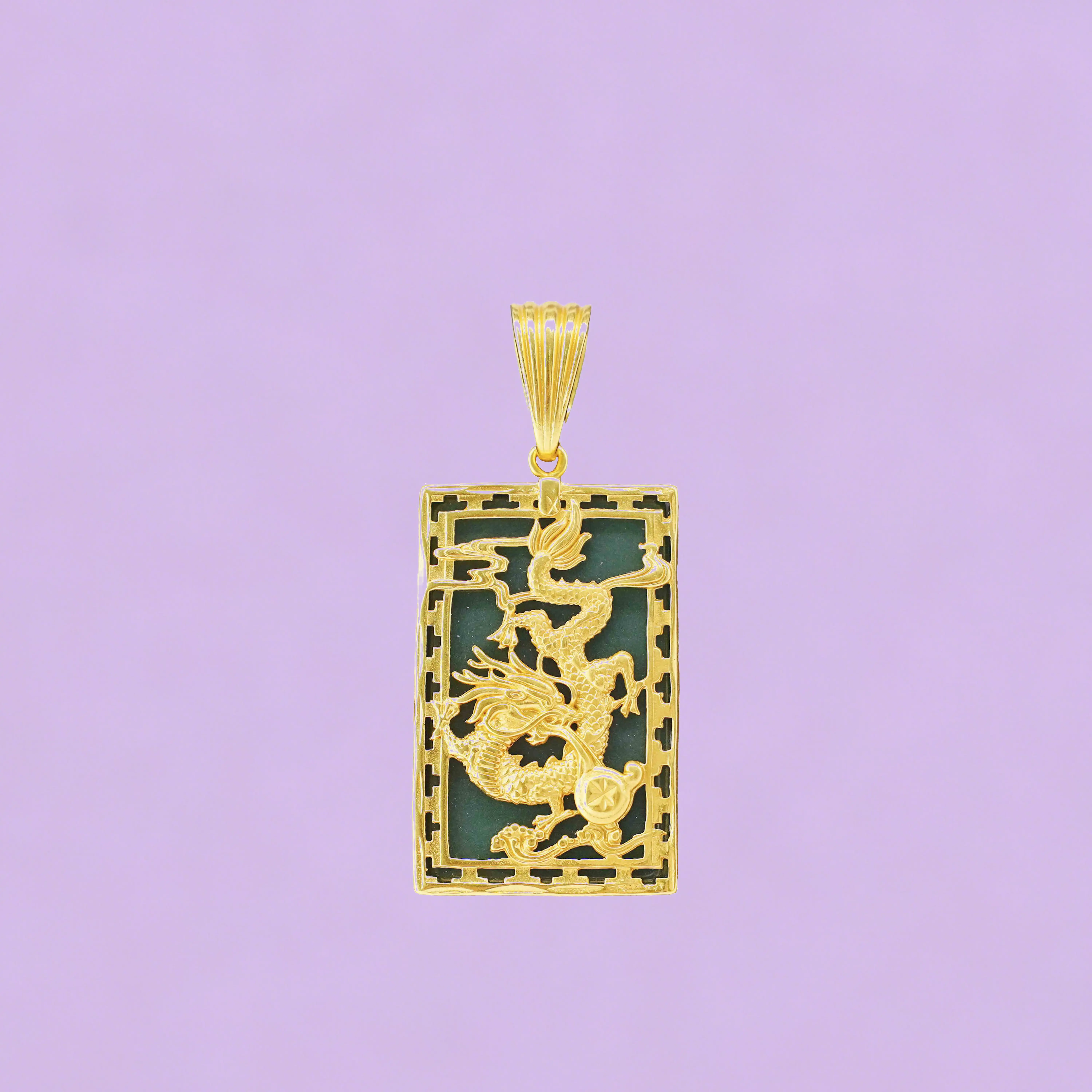 Crafted with incredible attention to detail, this rectangular pendant features a dynamic, three-dimensional dragon motif set against a rich, contrasting background. The dragon is depicted in a coiled, powerful pose, with every scale, claw, and flame meticulously rendered to capture its mythic energy. The intricate openwork frame around the edges adds an extra layer of texture and visual interest, evoking traditional architectural patterns and adding depth to the design.