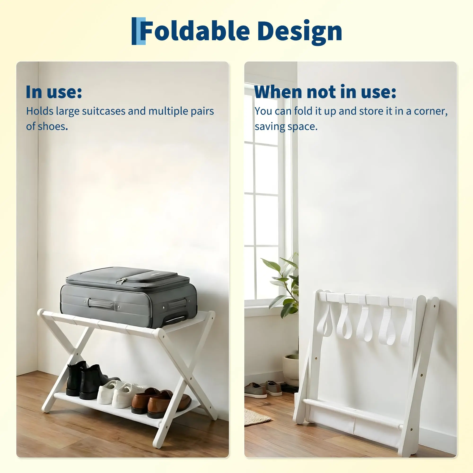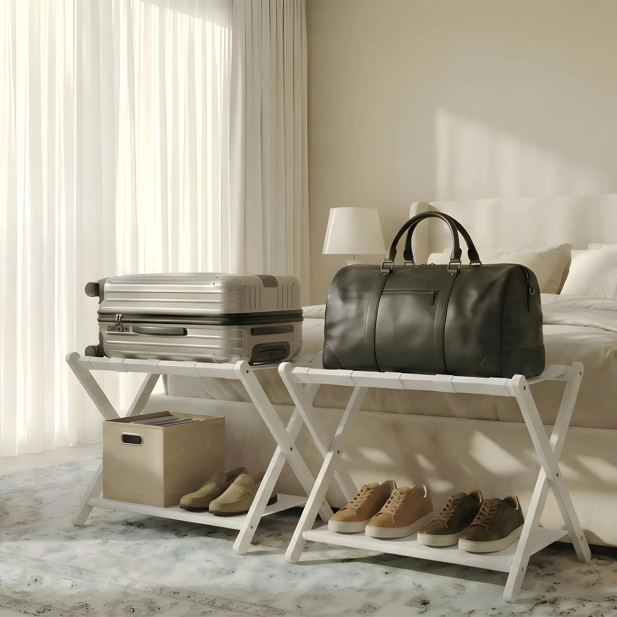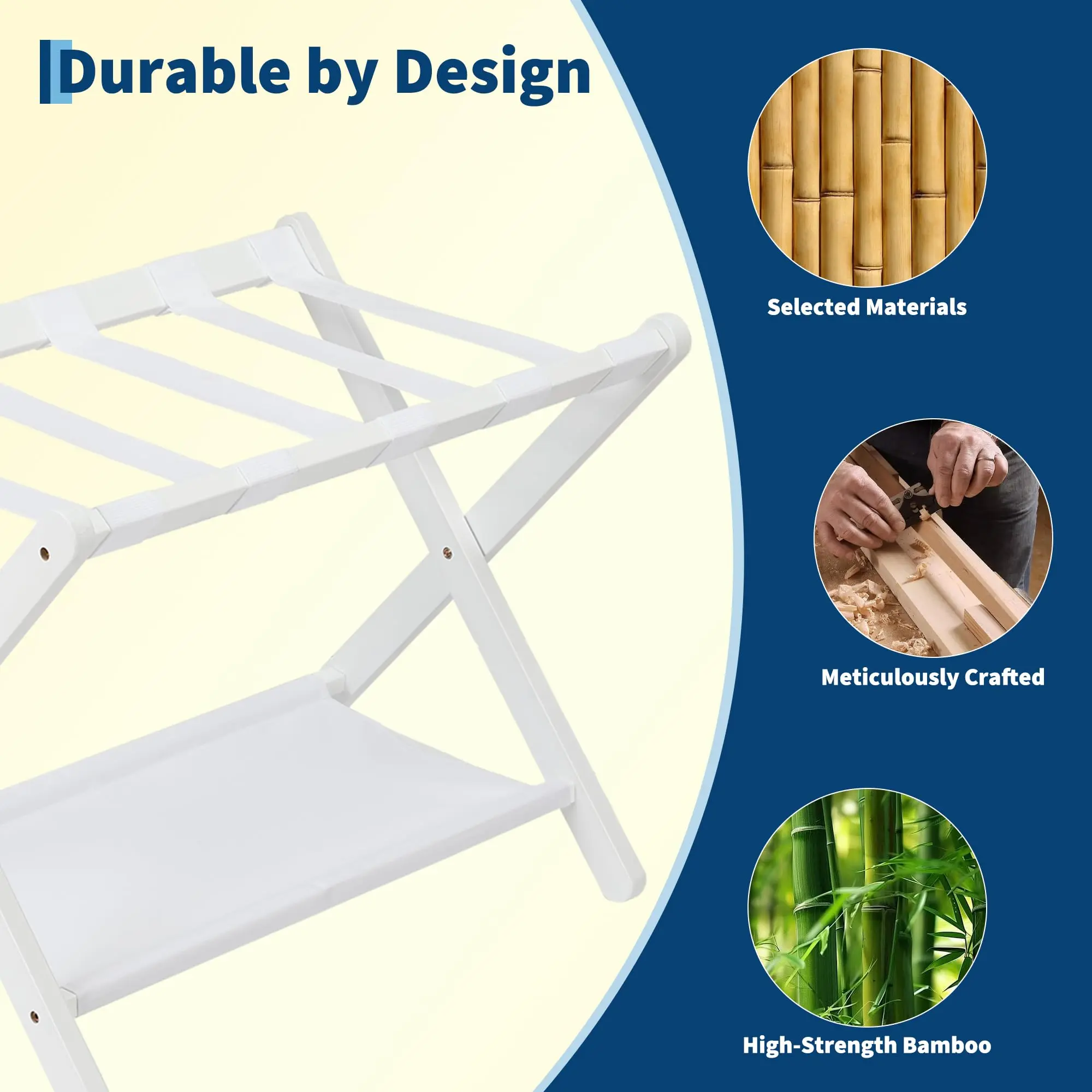 Garvee Premium Bamboo Folding Luggage Rack with Durable Nylon Straps and Storage Shelf, Supports Up to 110 lbs, Collapsible Suitcase Stand for Bedrooms, Guest Rooms, Hotels, Available in White, Brown, and Black, Set of 2