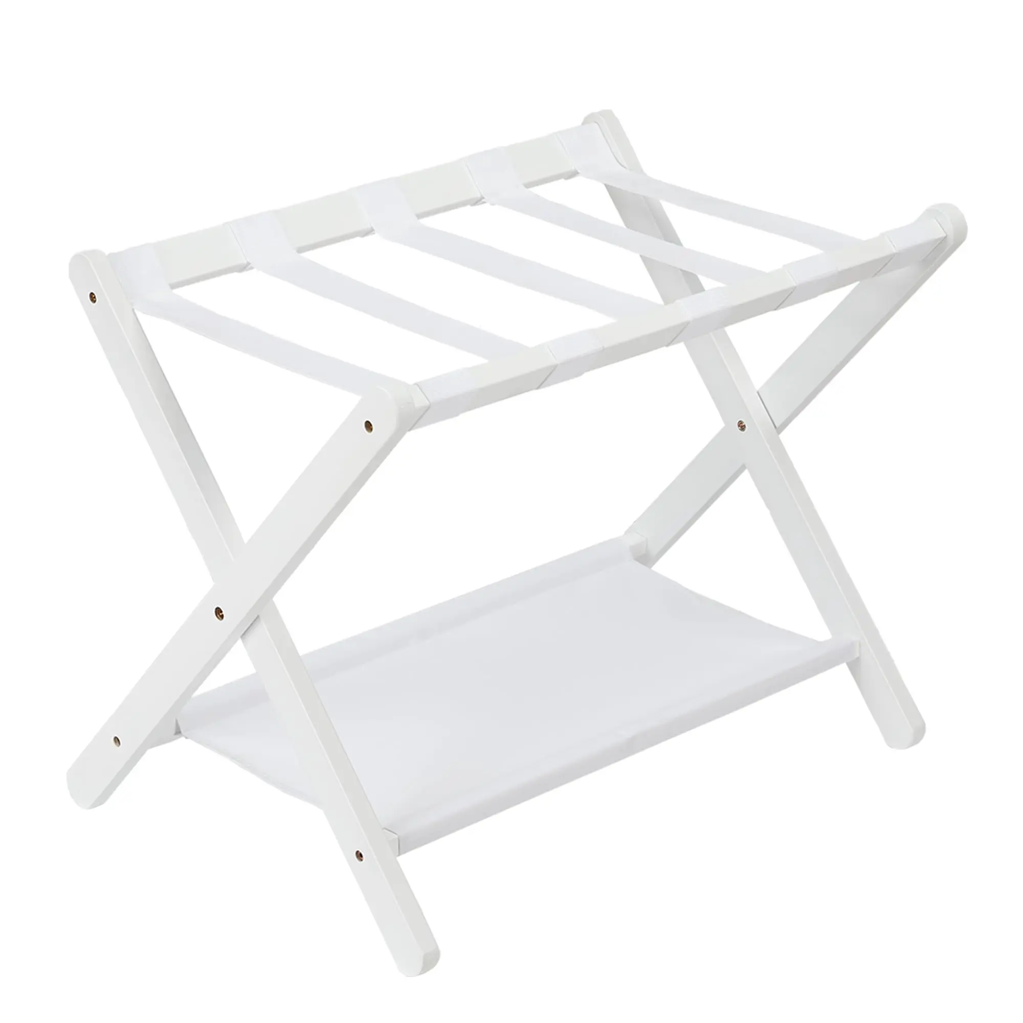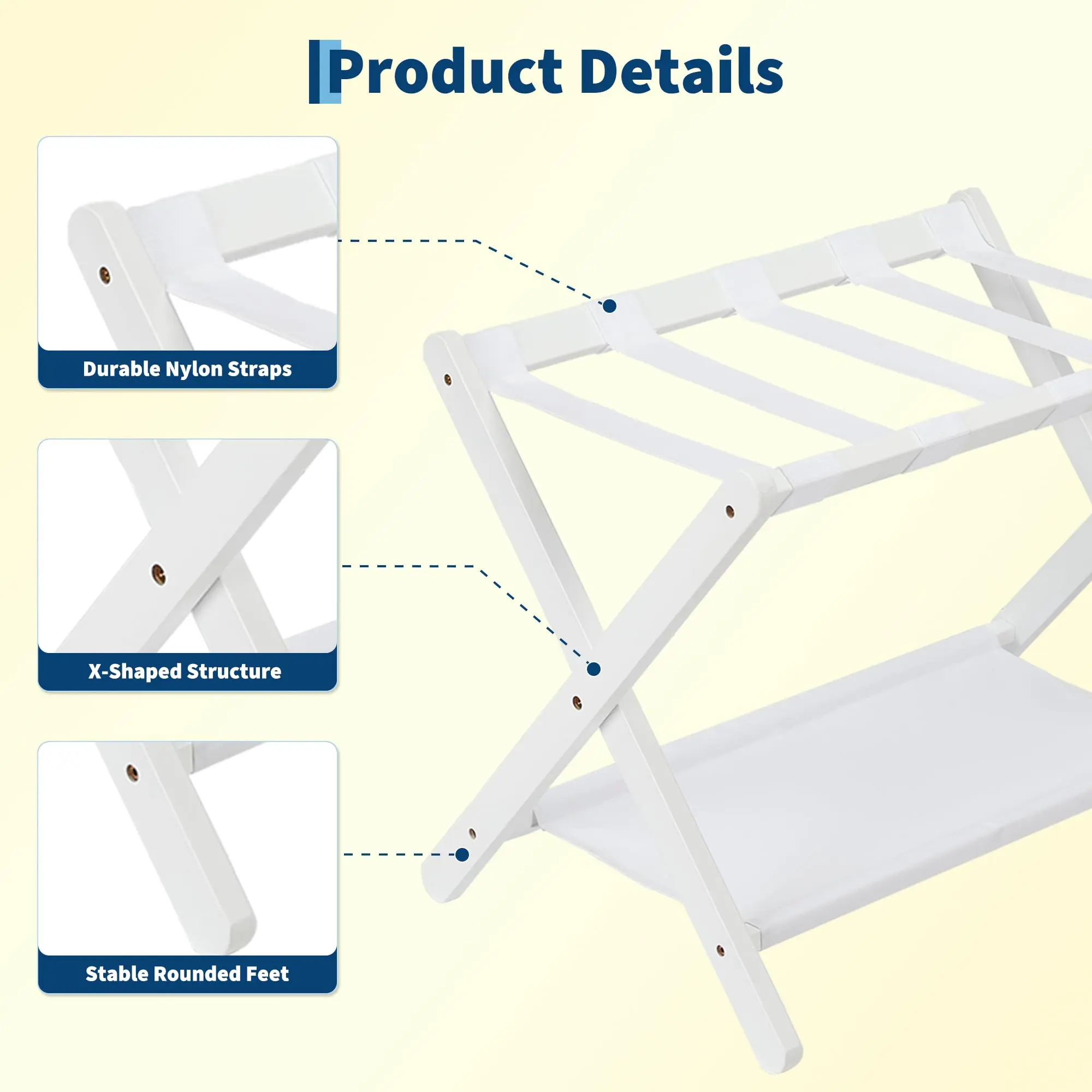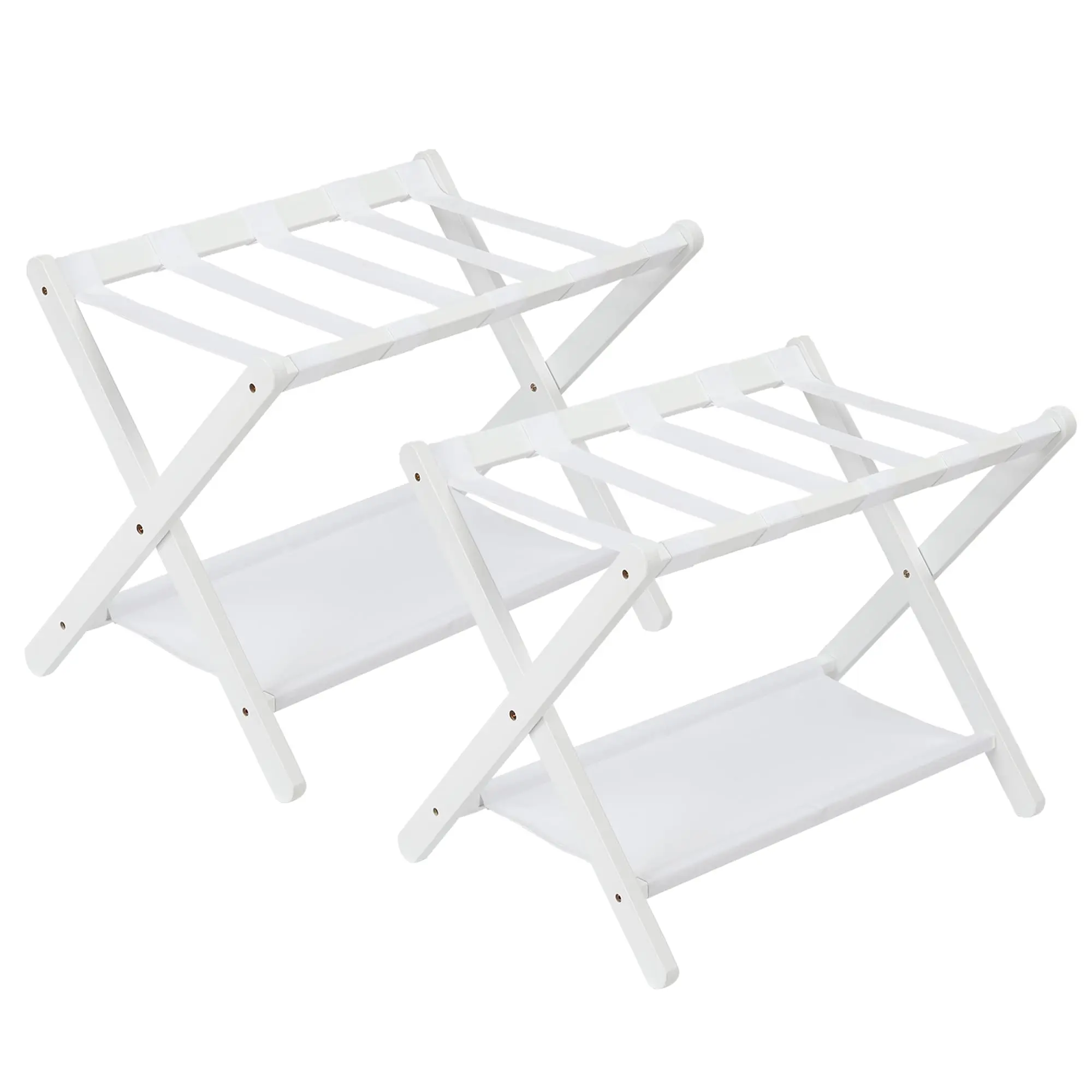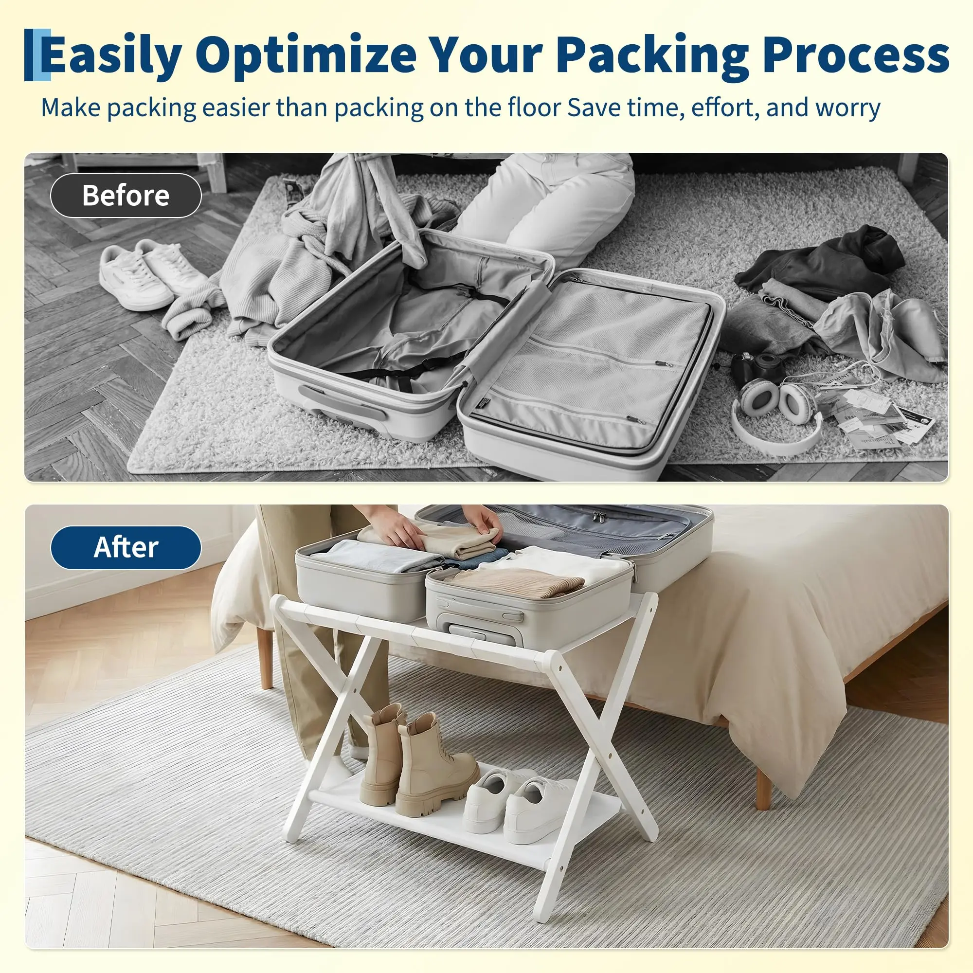 Garvee Premium Bamboo Folding Luggage Rack with Durable Nylon Straps and Storage Shelf, Supports Up to 110 lbs, Collapsible Suitcase Stand for Bedrooms, Guest Rooms, Hotels, Available in White, Brown, and Black, Set of 2