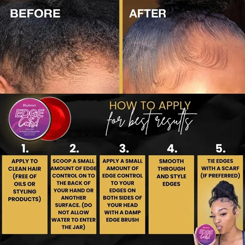 BLUIMON EDGE Control Gel with Castor Oil offers a fortified formula that lays edges flawlessly. It moisturizes and thickens hair without flaking or white residue. Achieve sleek styles with nourished edges. This gel supports hair growth and is suitable for all hair types. Perfect for coiled, kinky, or loose curls. It blends seamlessly with natural or relaxed hair for unified edge definition. Ideal for all ages, including kids.