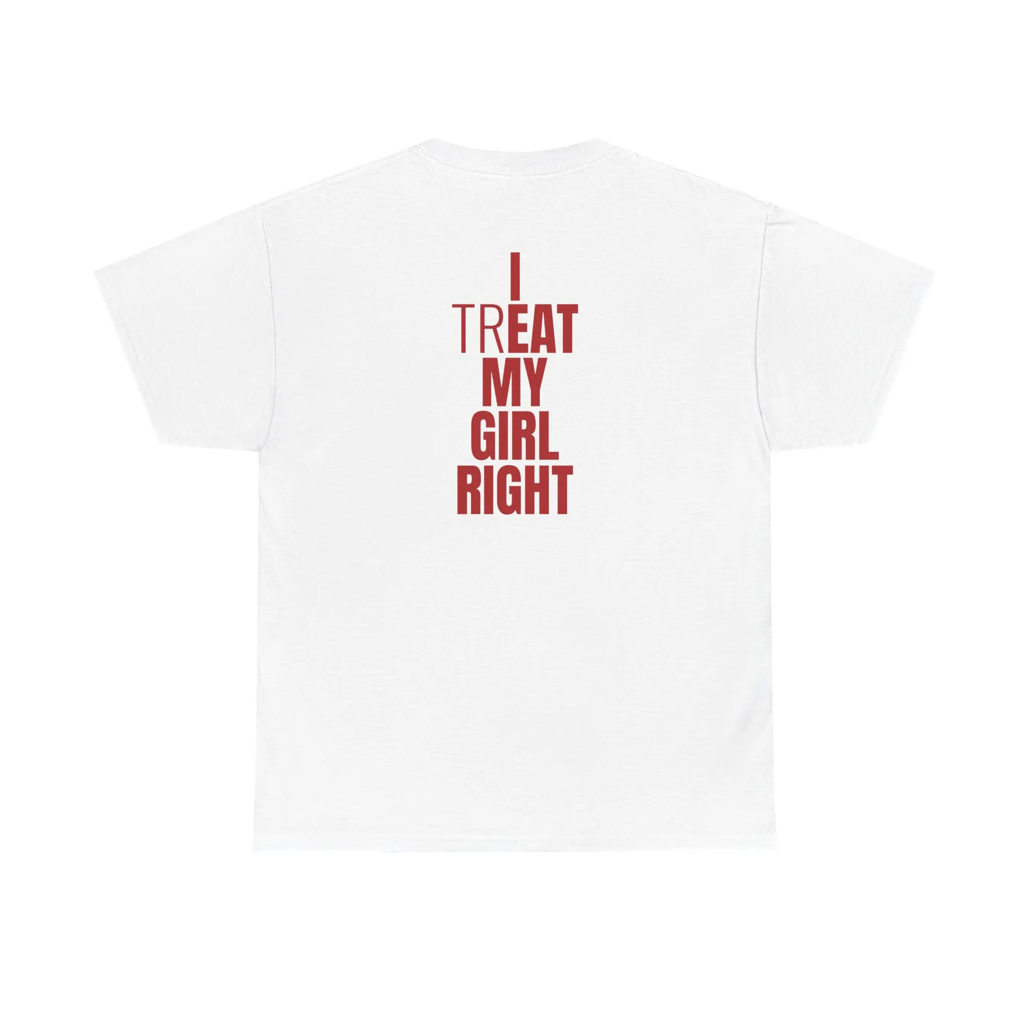 This classic tee carries a stacked, typographic back print in deep brick red that reads "I Treat My Girl Right". It sits relaxed on the shoulders and keeps its shape through everyday wear - a quiet, durable piece that becomes part of the rhythm of your days. Wear it on errands, late-night drives, small gatherings, or quiet mornings with coffee; the shirt talks with calm assurance while you get on with living. The visible texture of natural cotton and the clean ribbed collar give it an honest, lived-in feel that pairs easily with denim or a favorite jacket. It’s the perfect Valentine’s Day gift for boyfriends, husbands, or any man who takes pride in how he shows up in love.