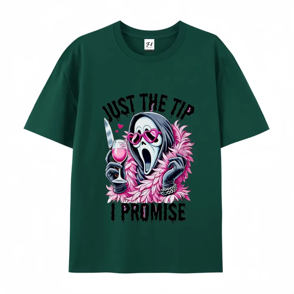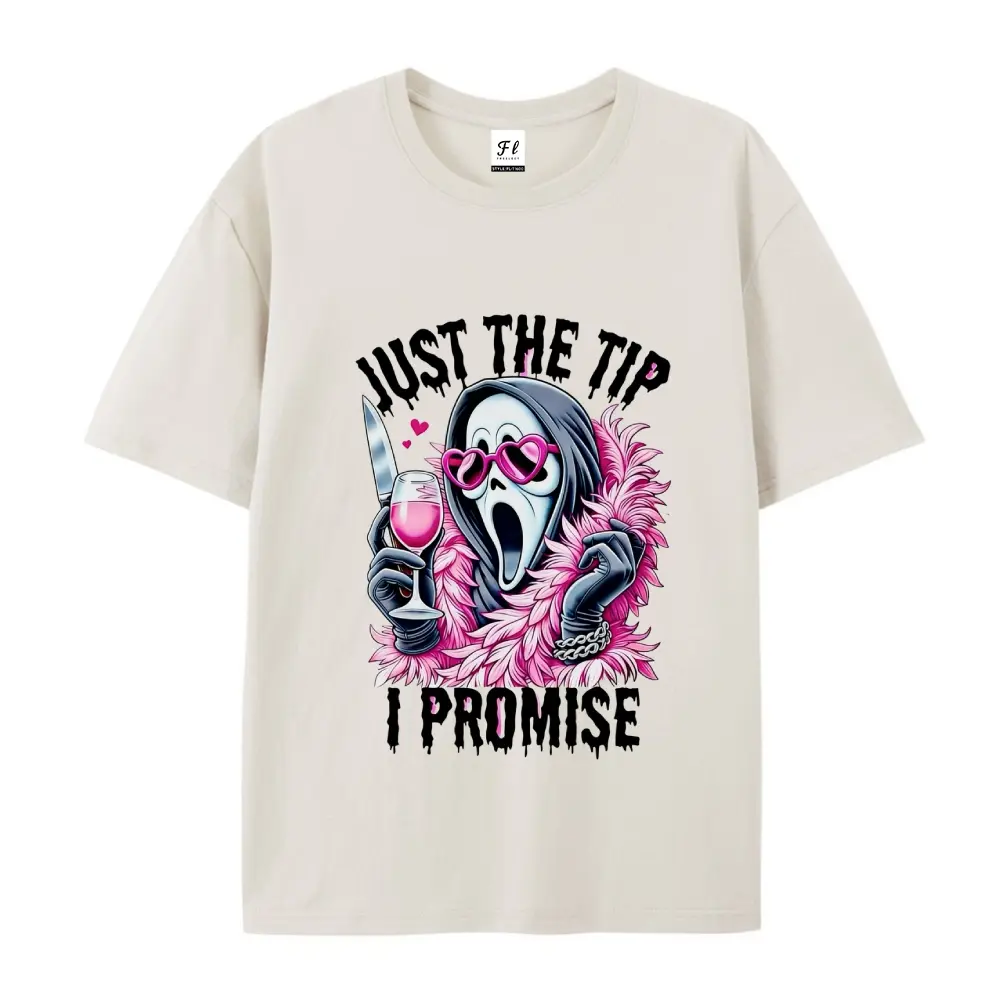 ✨ Unique Design: This T-shirt features a bold "Just The Tip I Promise" graphic with a Ghostface character. The design includes a pink feather boa, sunglasses, and a wine glass, adding a playful twist. Perfect for casual streetwear enthusiasts.
