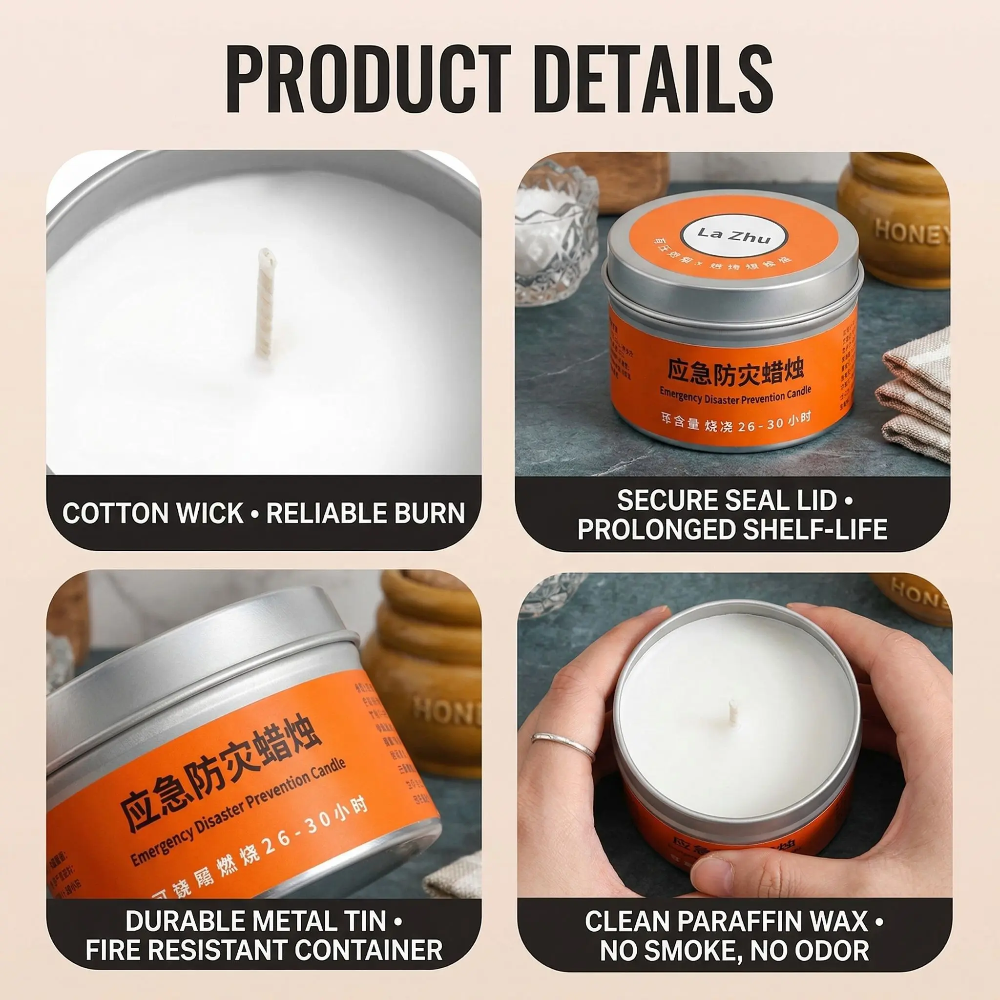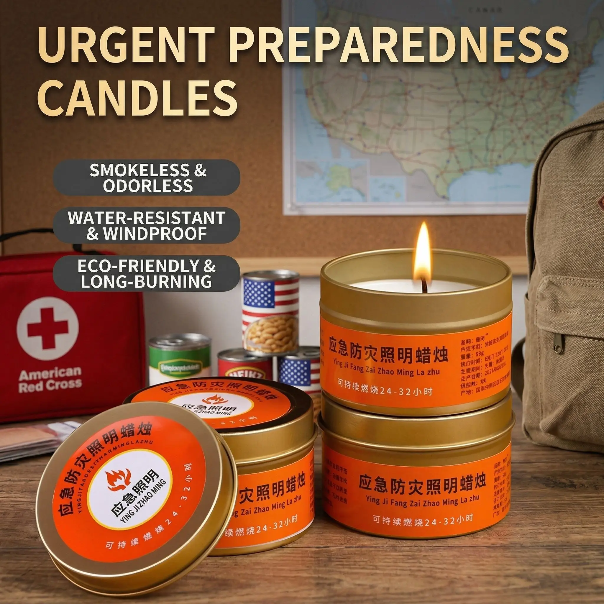 ·Long-Burning Emergency Candles (Pack of 3): Perfect for survival kits, power outages, camping, and disaster preparedness. Each candle offers a reliable 30-hour burning time, ensuring you have heat and light when you need it most.