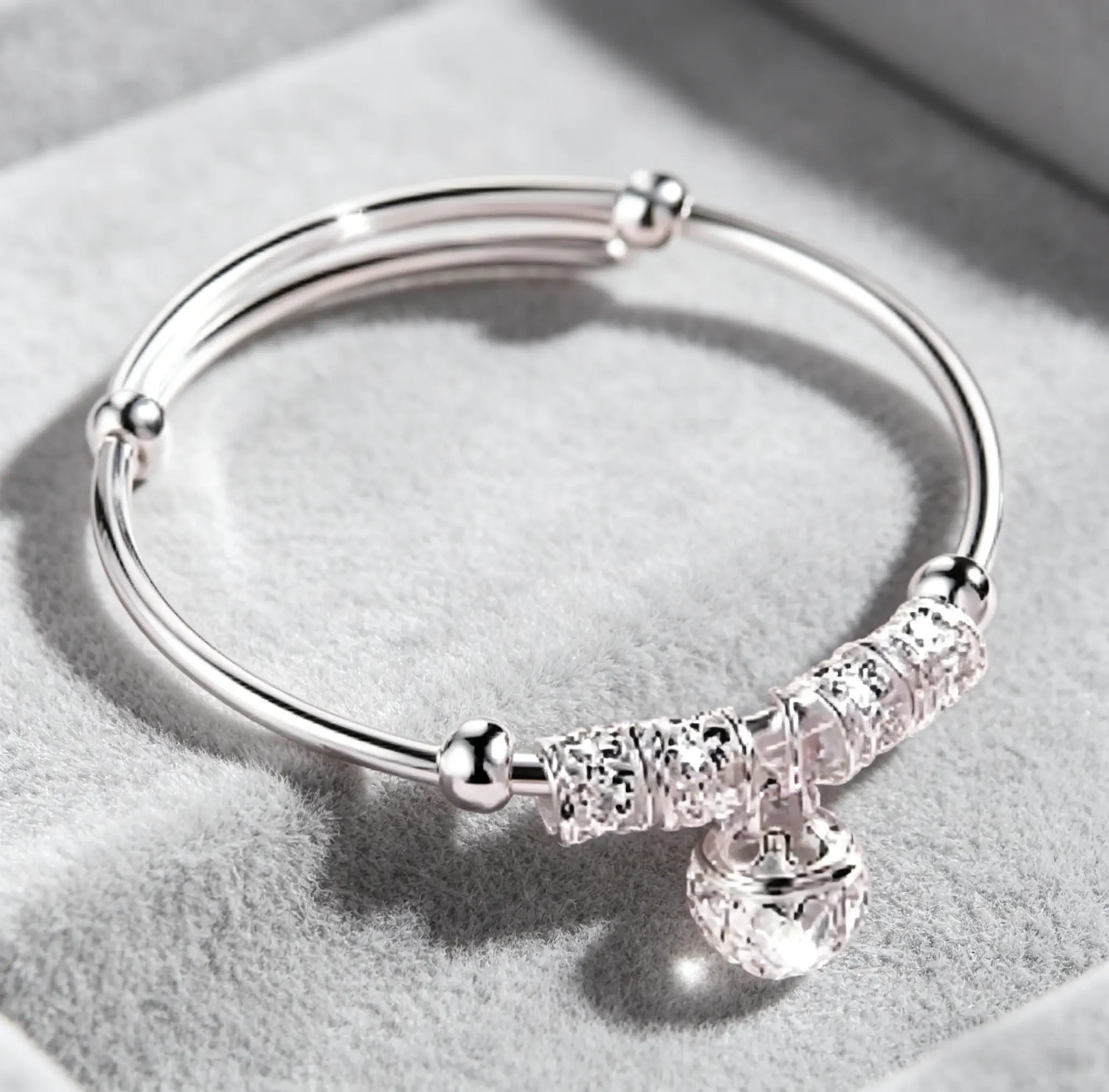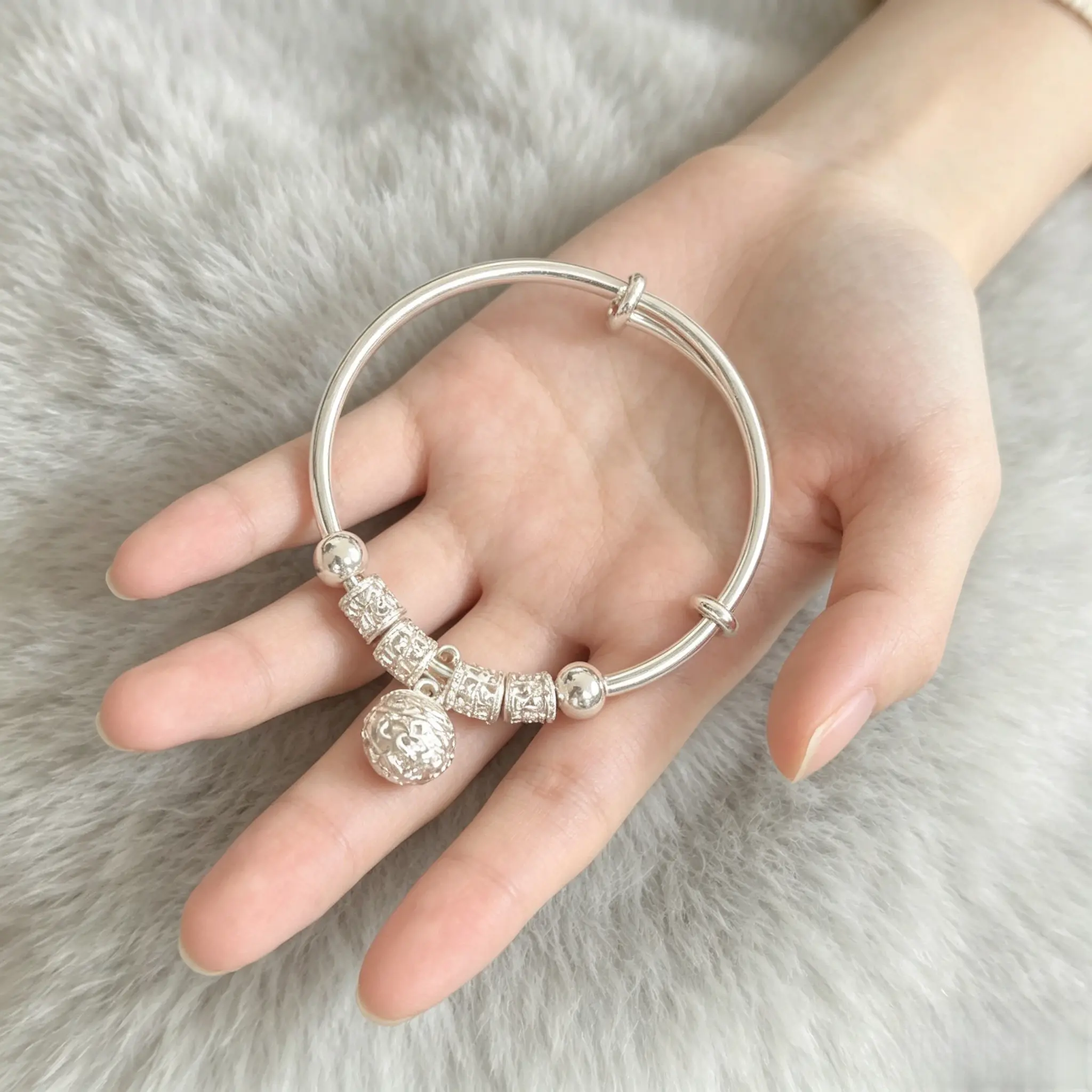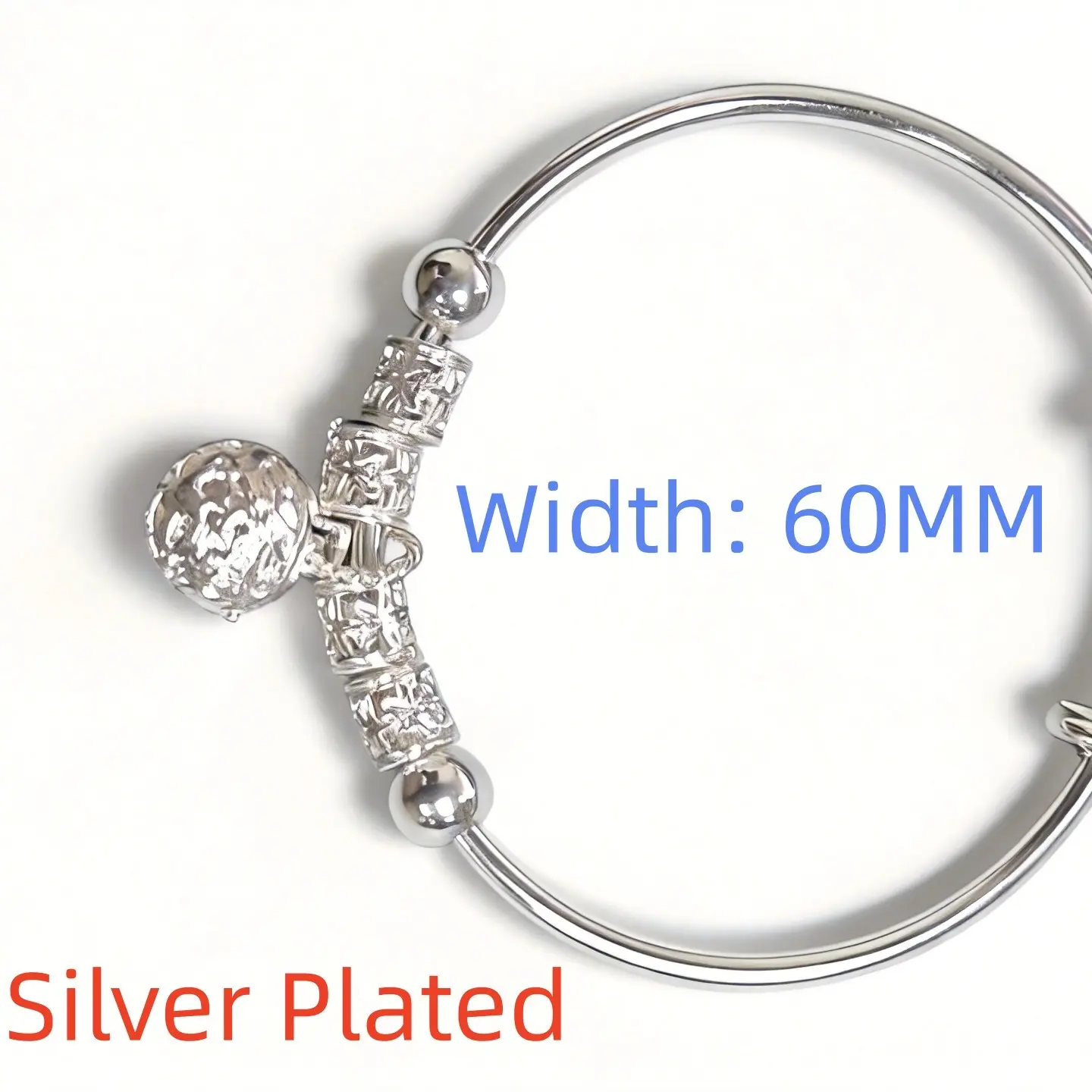 Elevate your jewelry collection with this stunning 925 silver plated adjustable bangle!Width: 60MM Crafted with intricate rotating lucky beads and a delicate hanging bell charm, this bracelet blends timeless elegance with meaningful symbolism, perfect for adding a touch of luxury to any look, from casual everyday wear to special occasions.