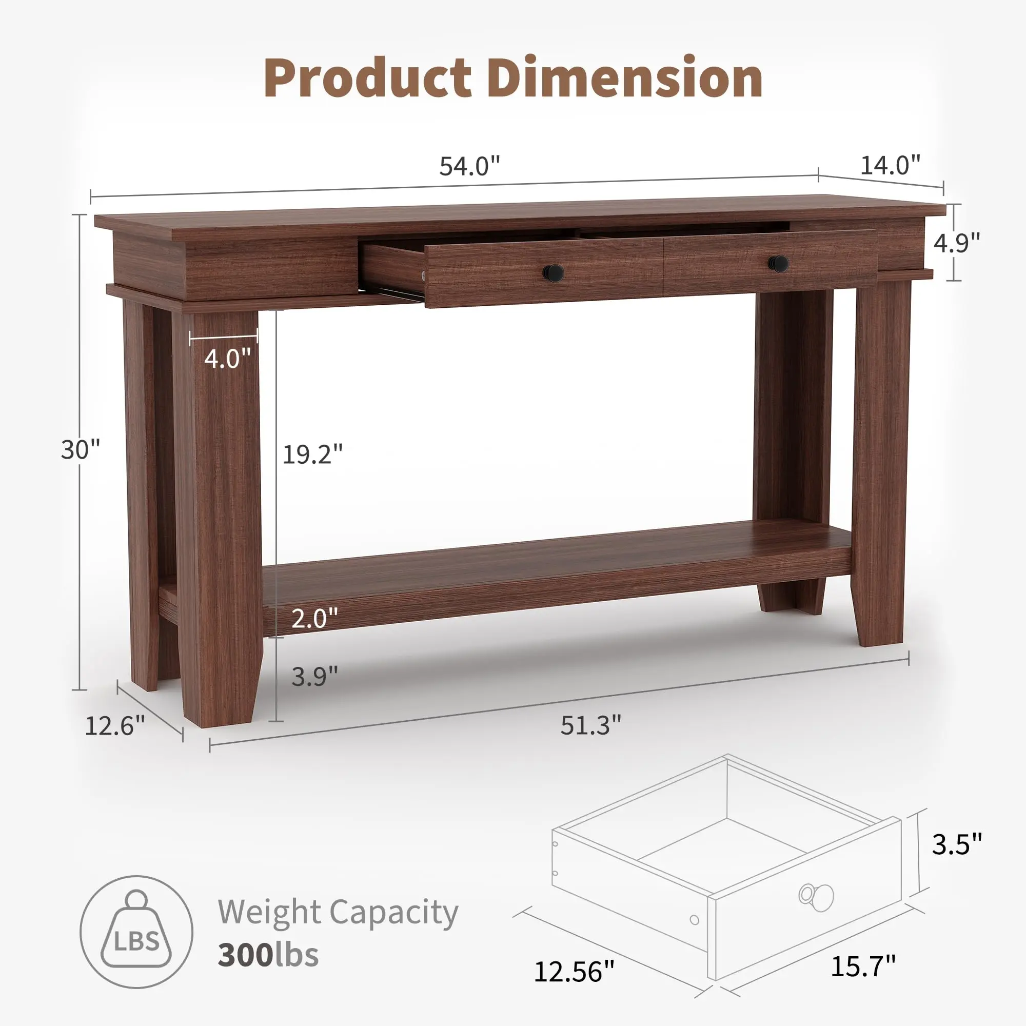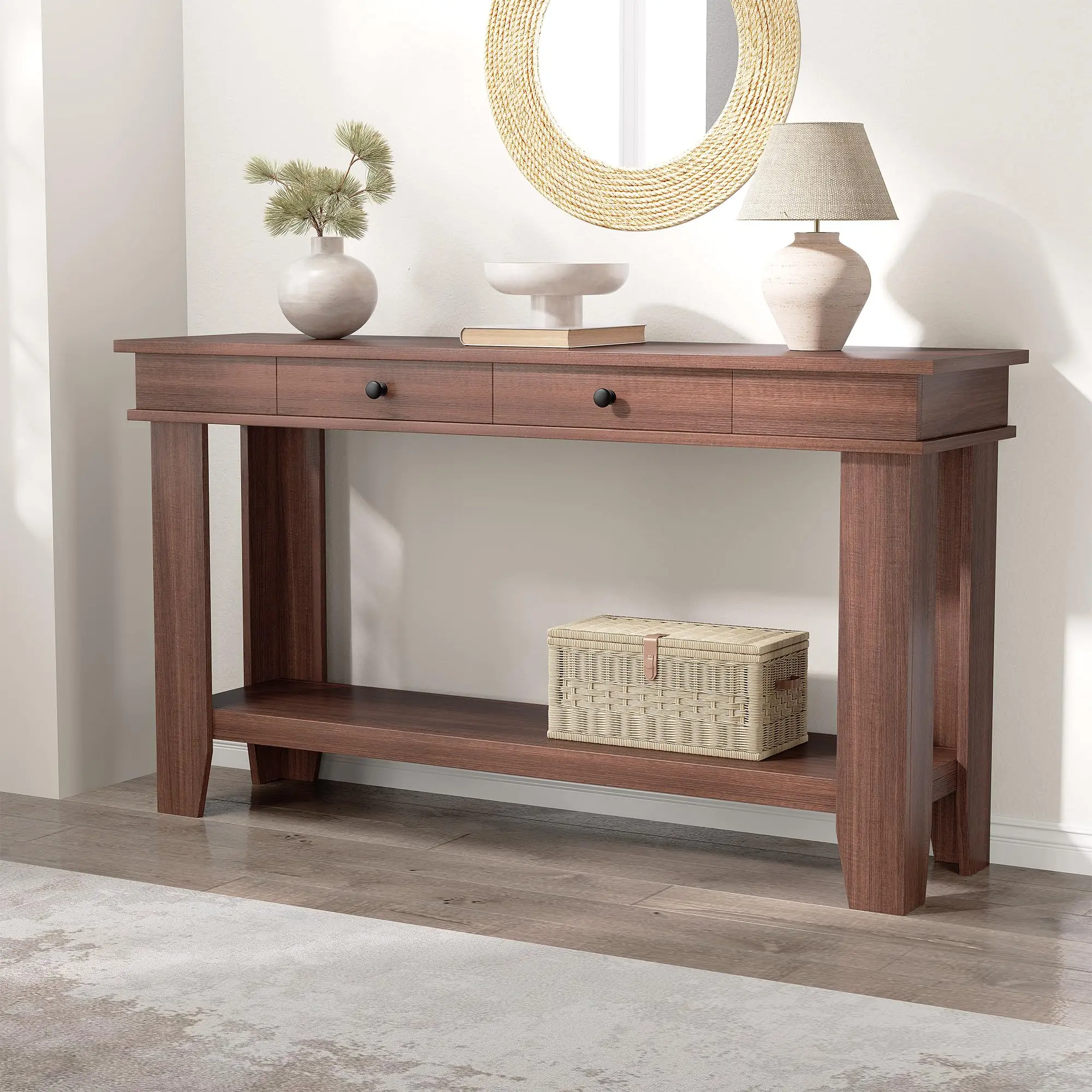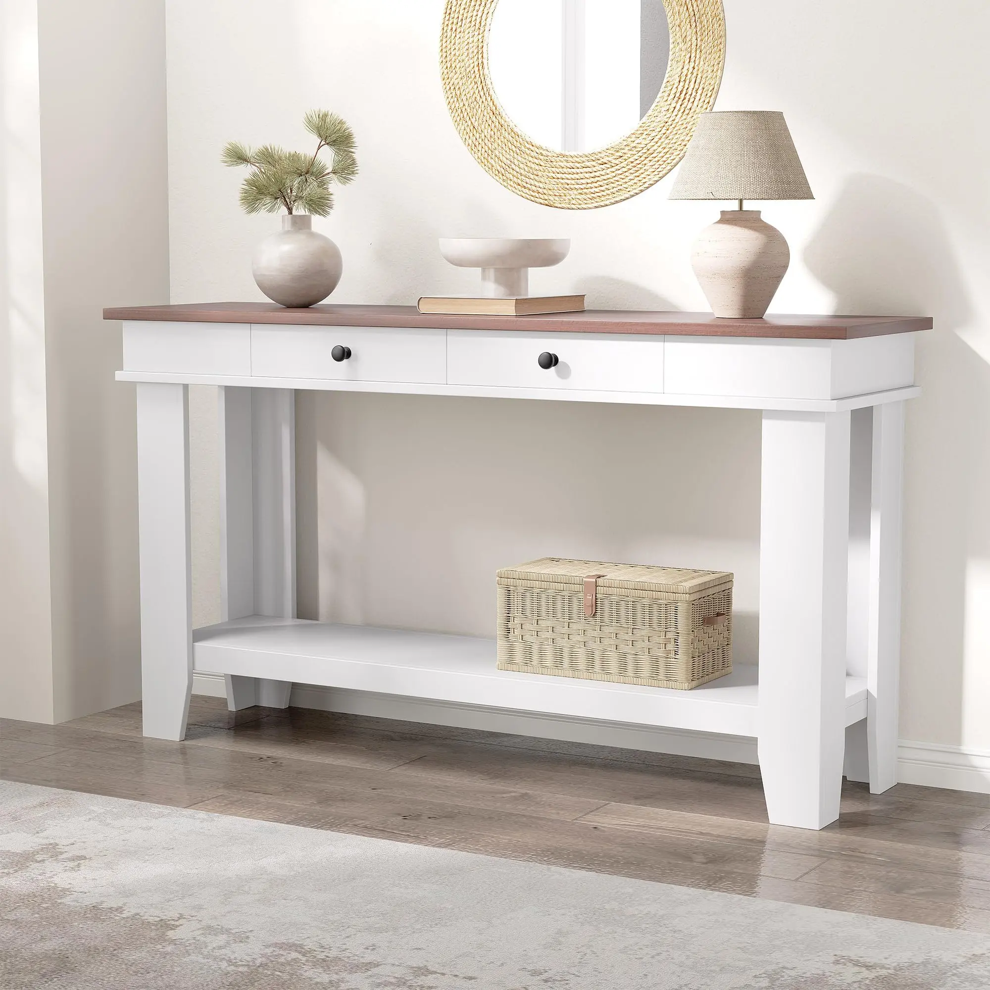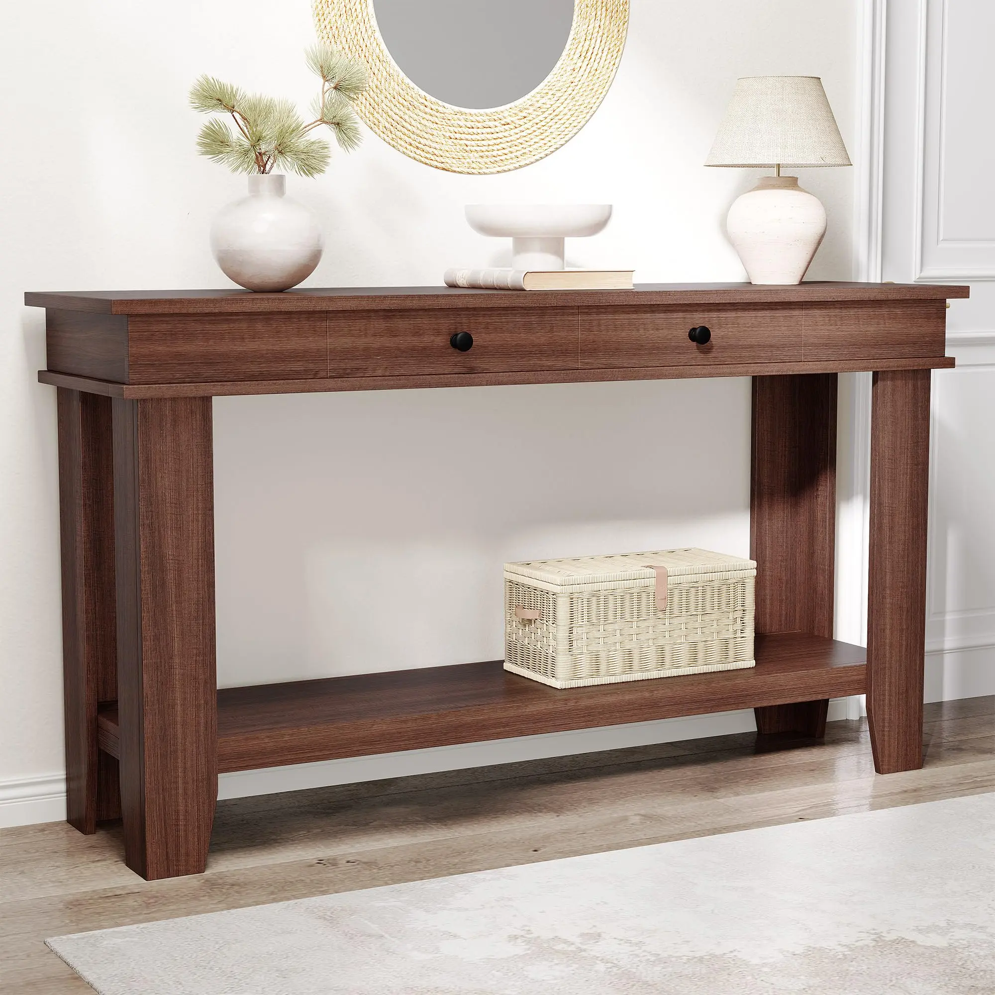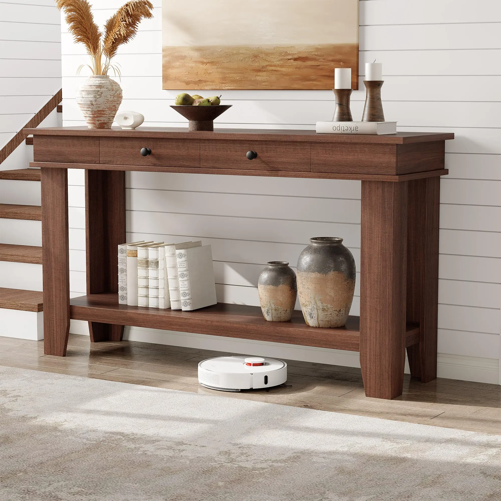 · 【Dual-Drawer Storage & Open Shelving】 This console table with storage features 2 spacious drawers and a 2-tier shelf. Perfect for stowing keys, blankets, books, or displaying baskets—keeping clutter hidden while maintaining easy access to everyday items