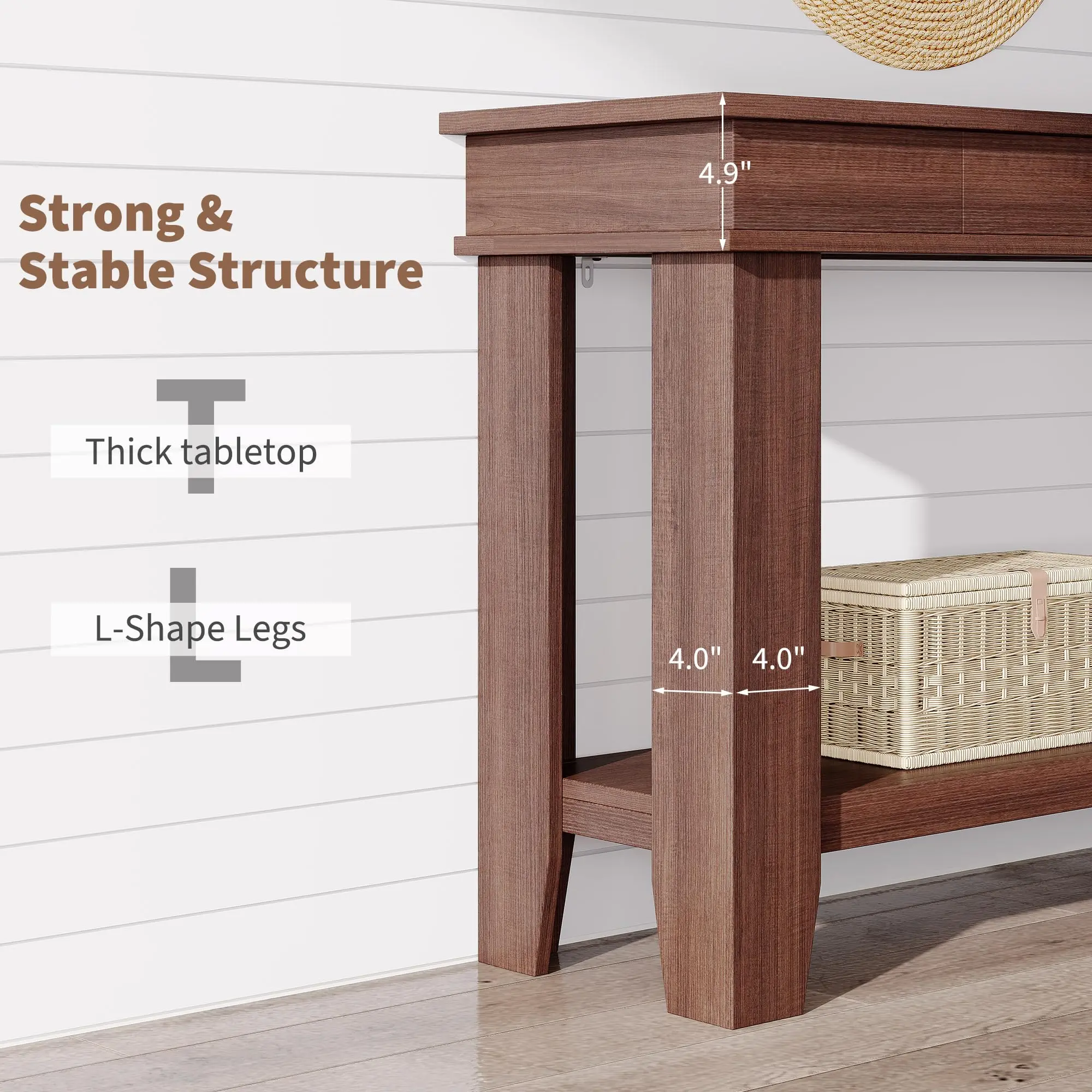 · 【Sturdy Craftsmanship and Material】 Crafted with reinforced MDF, the foyer table withstands daily use with scratch-resistant surfaces that are easy to clean. Protective non-slip foot pads safeguard floors while anti-tip fittings add safety assurance for family homes