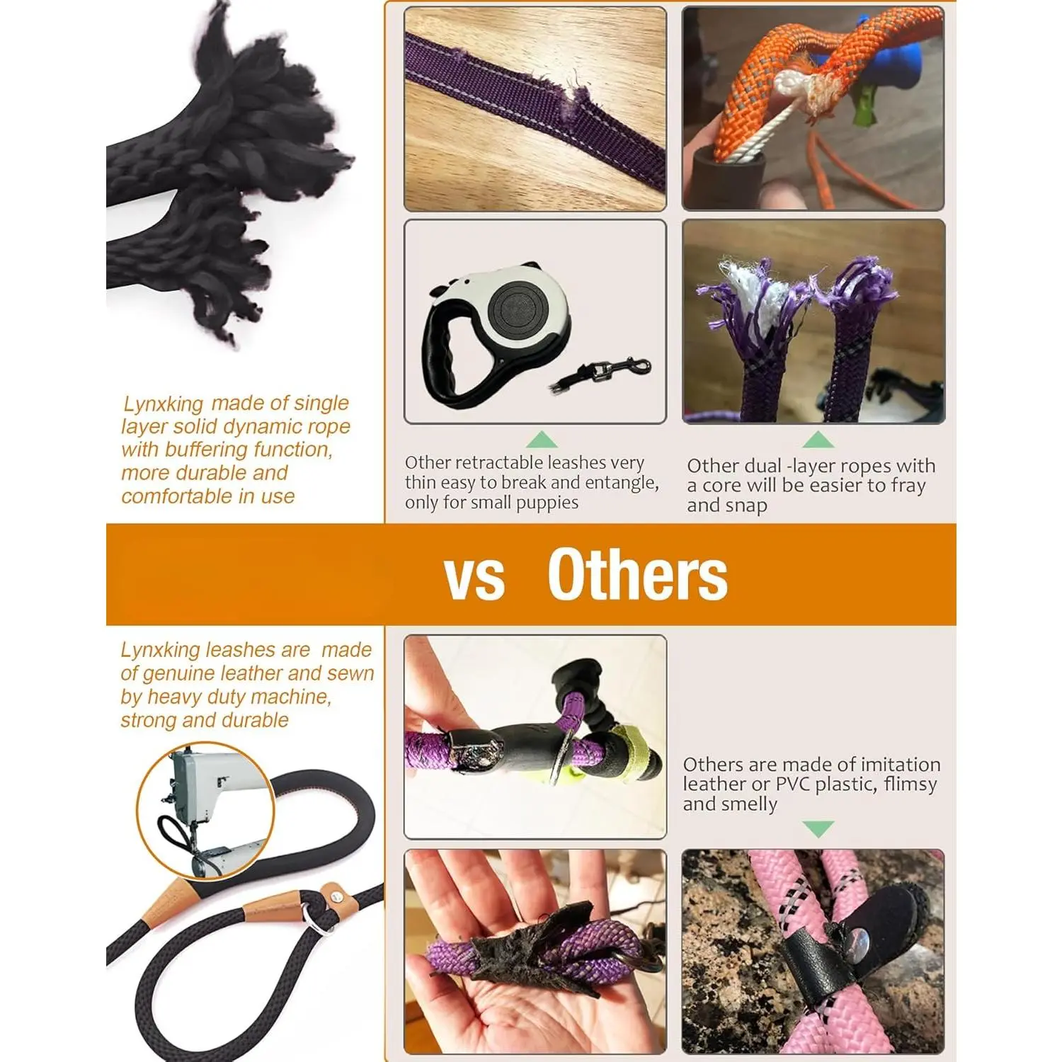 ·Strong and Lightweight- This tough dog leash made of strong and heavy-duty braided nylon rope, thick padded handle, super sturdy metal ring, and the knots bound with leather cover