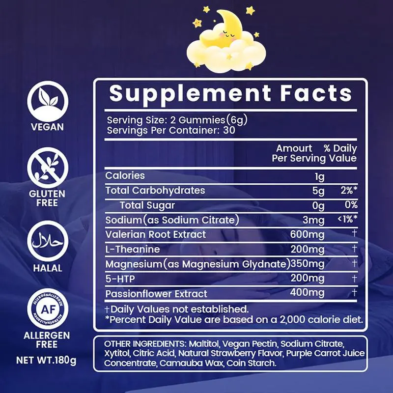 Valerian Root Extract: Helps improve sleep quality, naturally reduces stress and anxiety.