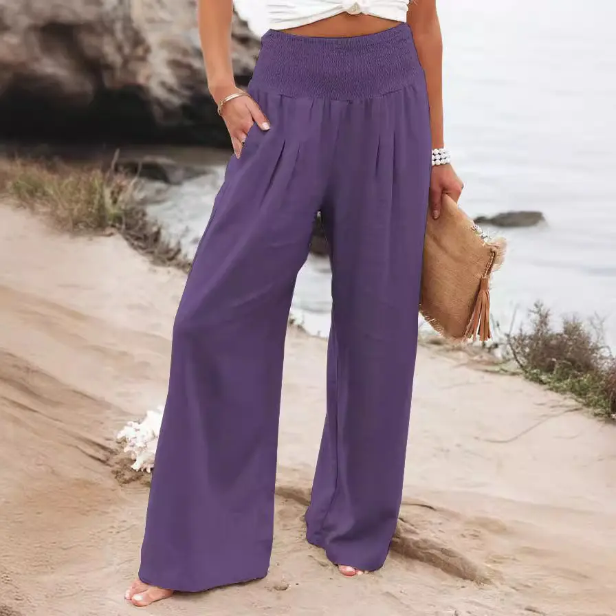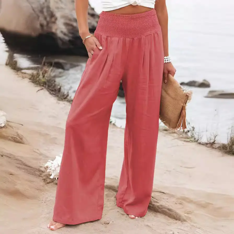 Women's Spring/Summer Beach Vacation Style Pants, Casual Wide-Leg Cotton-Linen Loose-Fit Trousers, Popular Beachwear Matching Pants for Women
