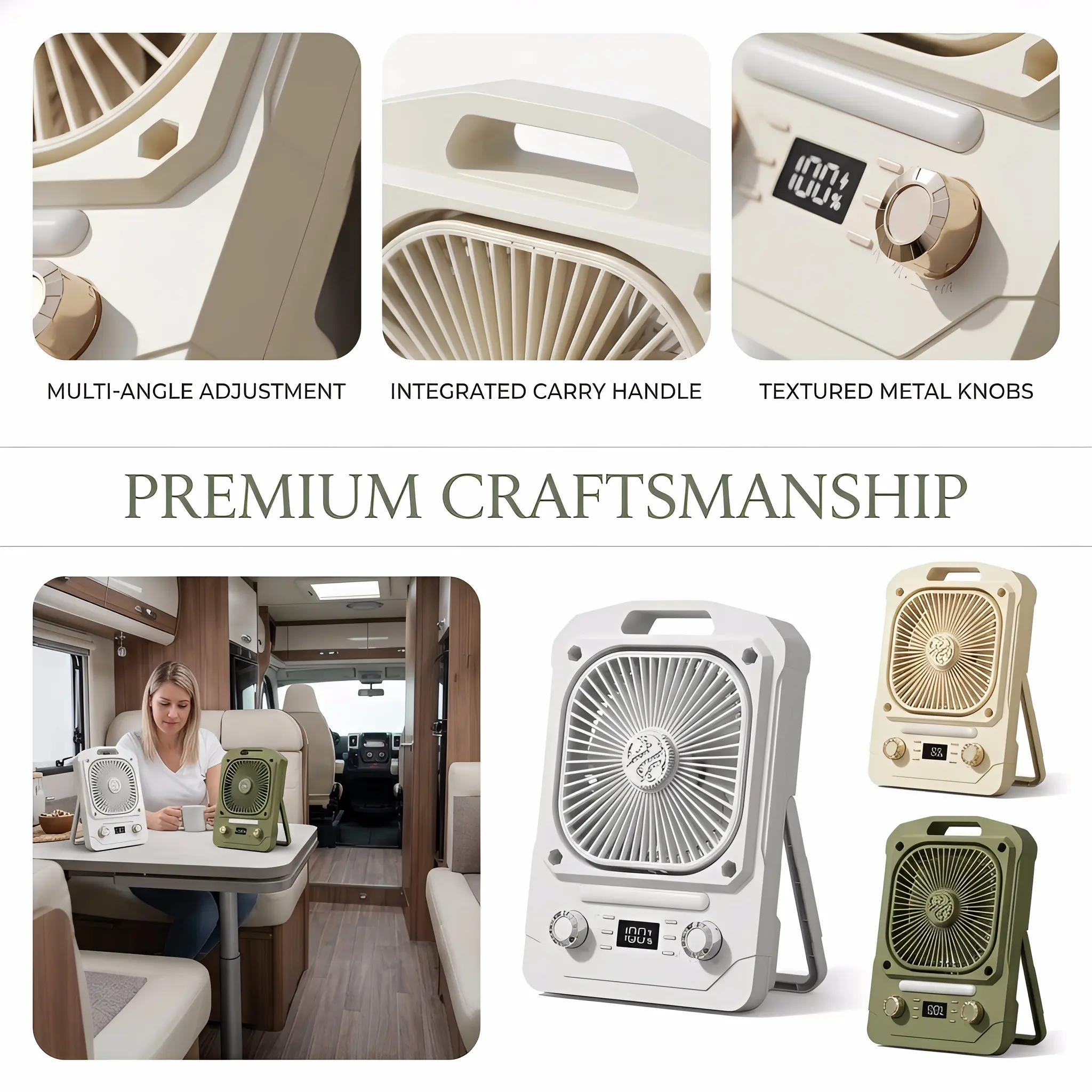 Upgrade your outdoor experience with thisAll-in-One Portable Camping Fan, combining apowerful fan, Bluetooth speaker, and LED lightin one compact device.Whether you're camping, traveling, or facing a power outage, this fan is designed to keep you cool, entertained, and well-lit-anytime, anywhere.