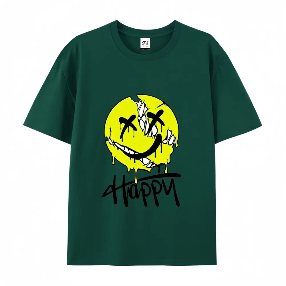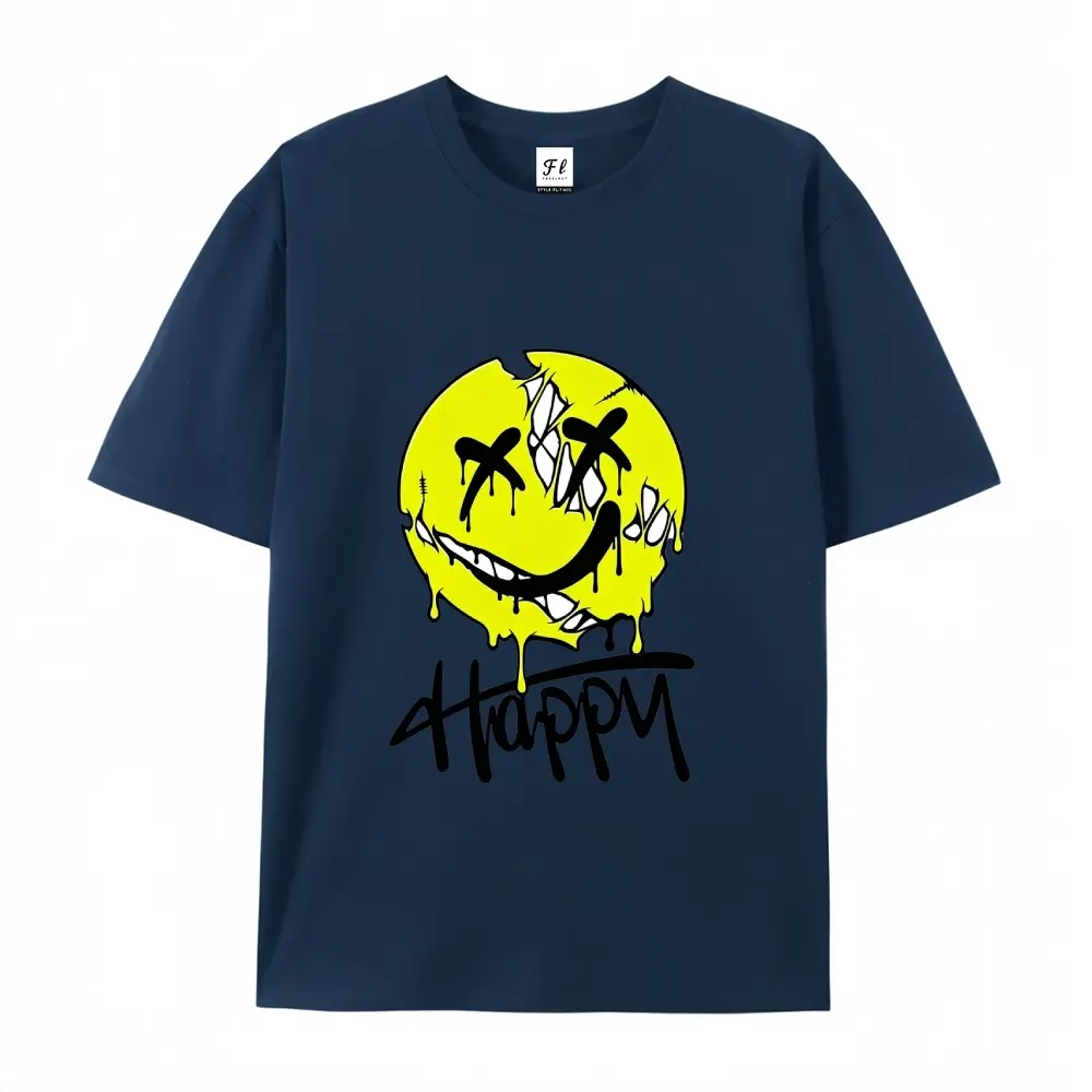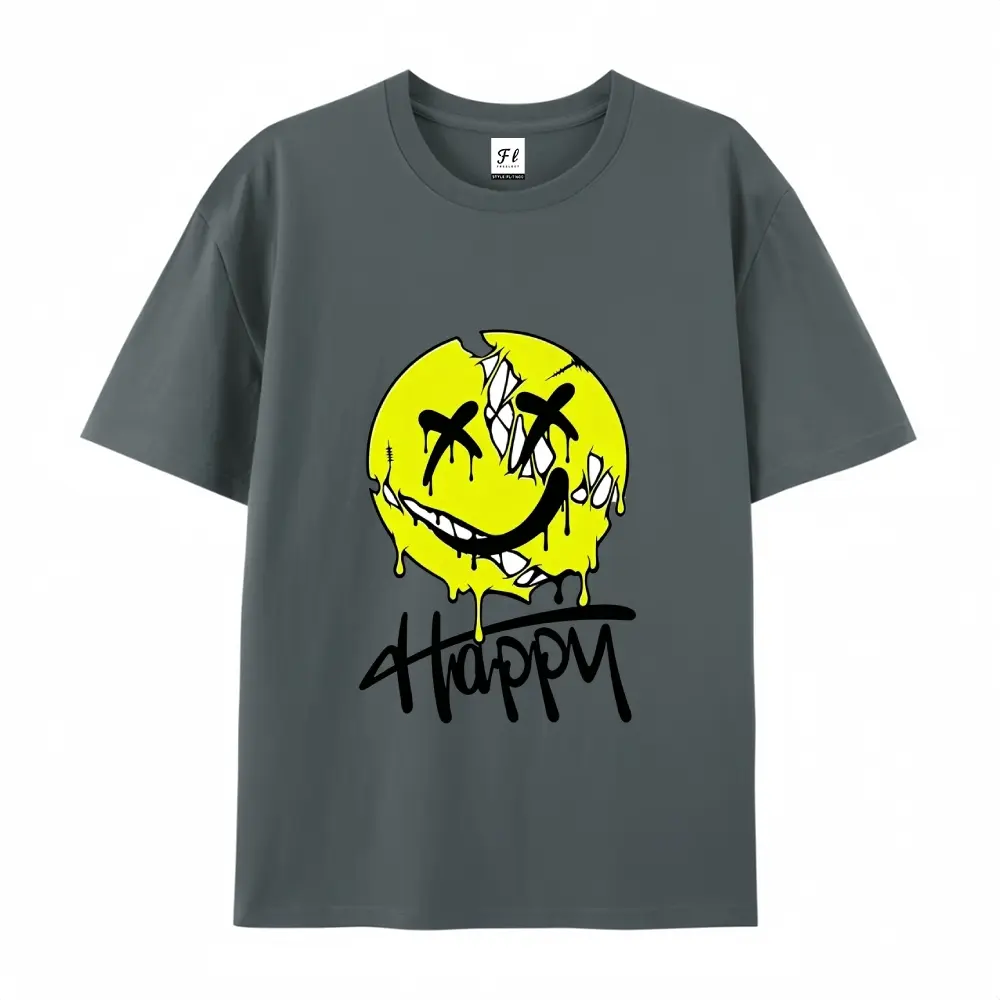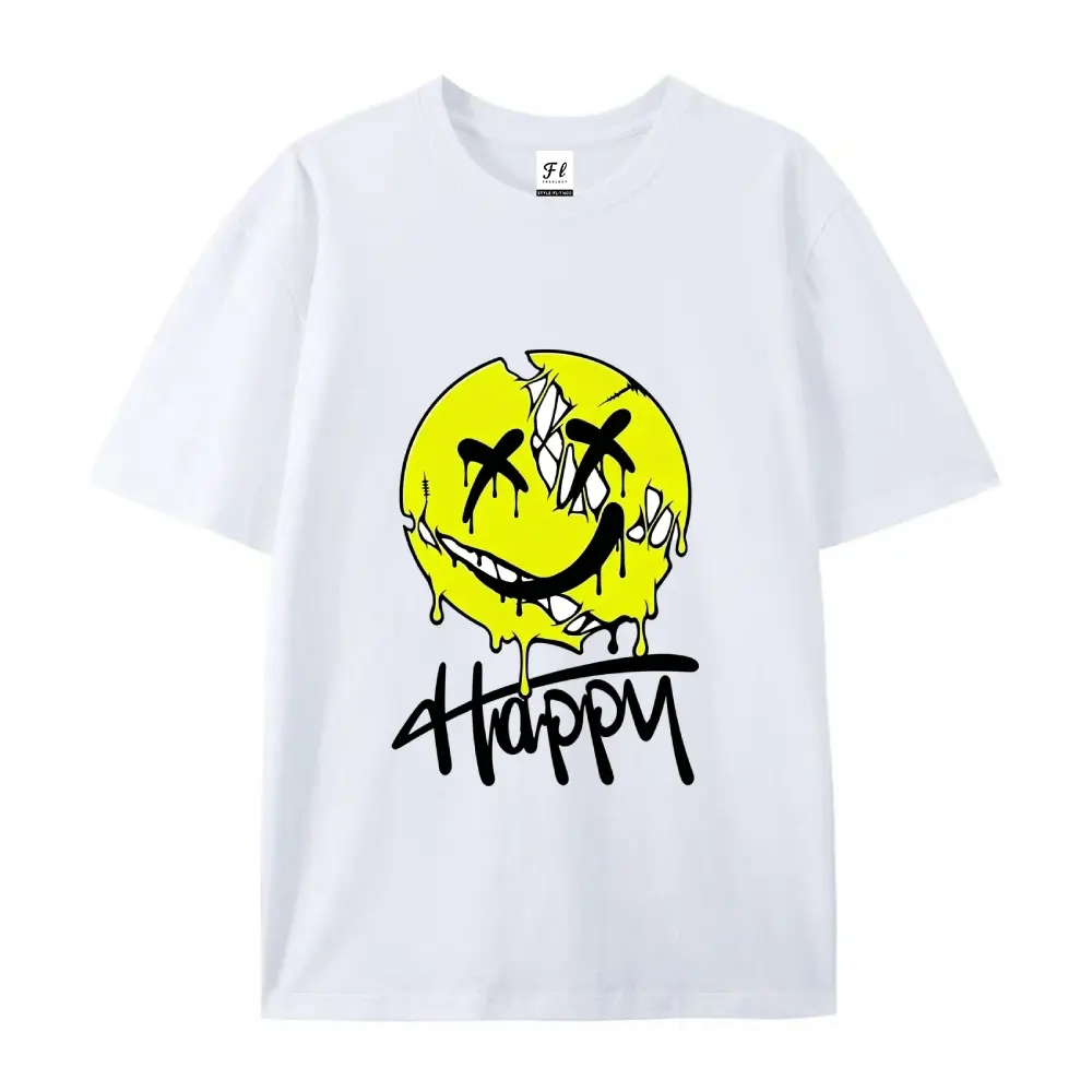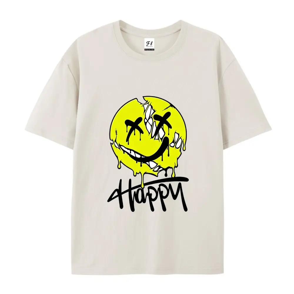 ·Smiley Print: Features a yellow dripping smiley with "Happy" written below.