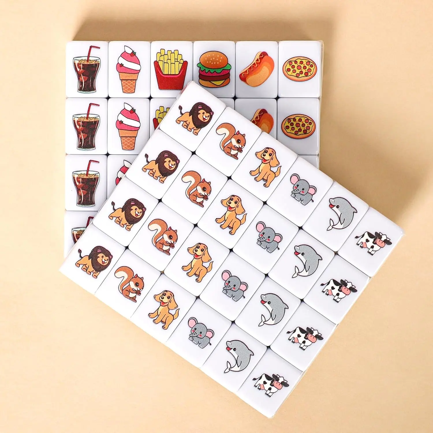 Our mahjong tile game has a total of 50 tiles (2 Blank Spare), The premium mahjongg tiles are made of super high quality and scratch-resistant melamine, A total of 12 different patterns were printed, with clear patterns. You can develop different games, no matter how you play, it will make the game very interesting.