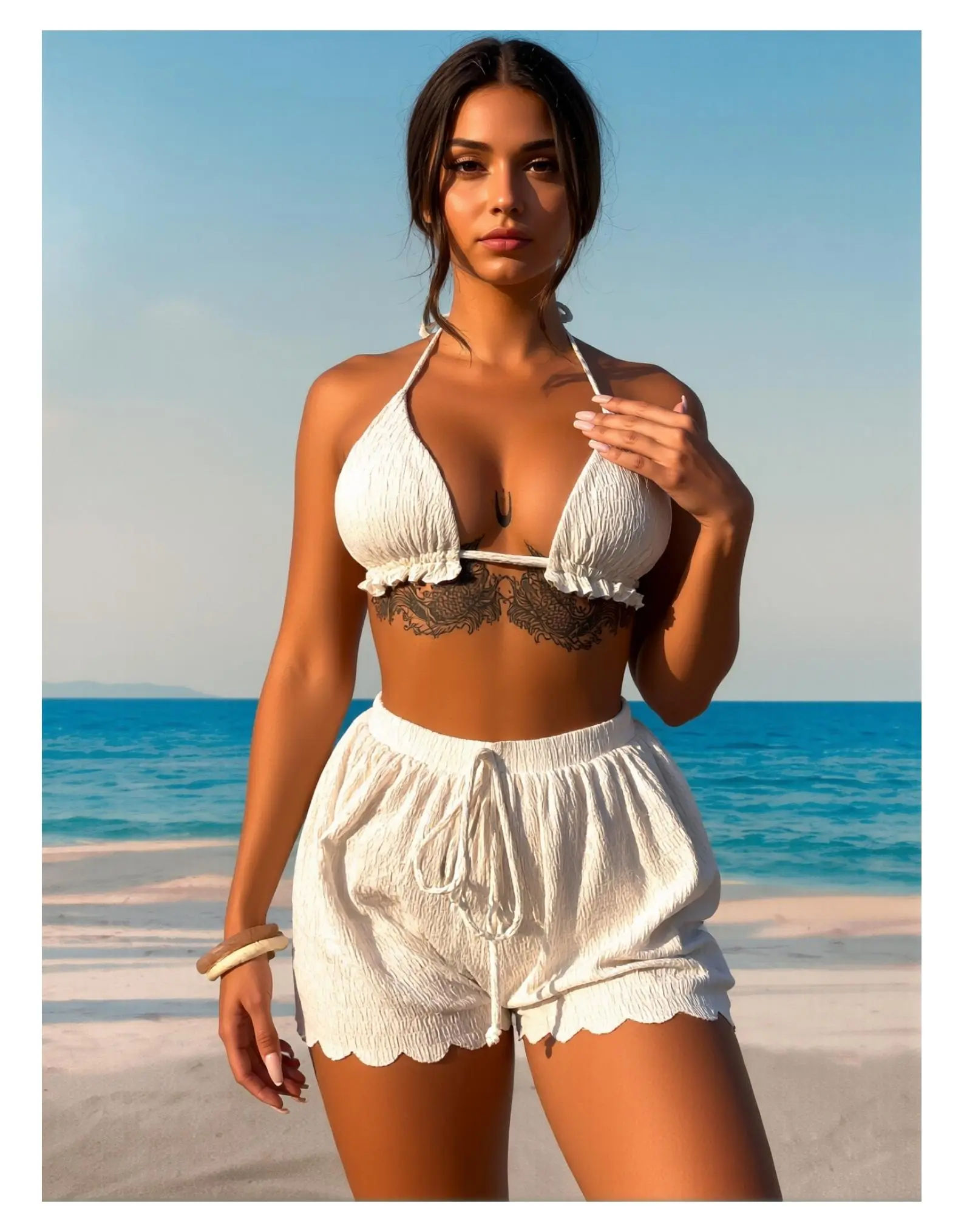 White Bikini Set for Women - Ruffled Halter Two Piece Swimsuit with High Waisted Cover Up Shorts - Scalloped Beach Bathing Suit - Summer Vacation Swimwear