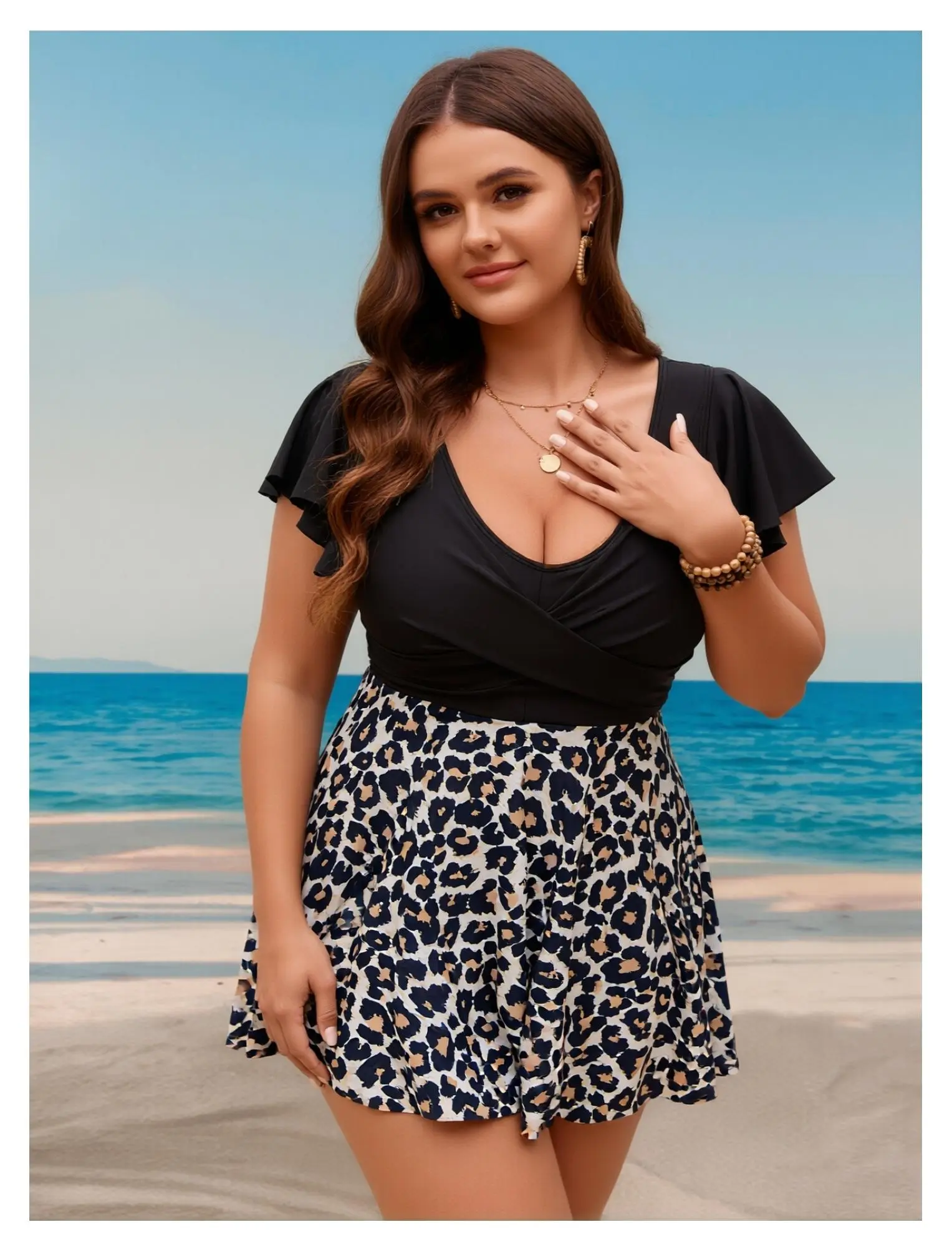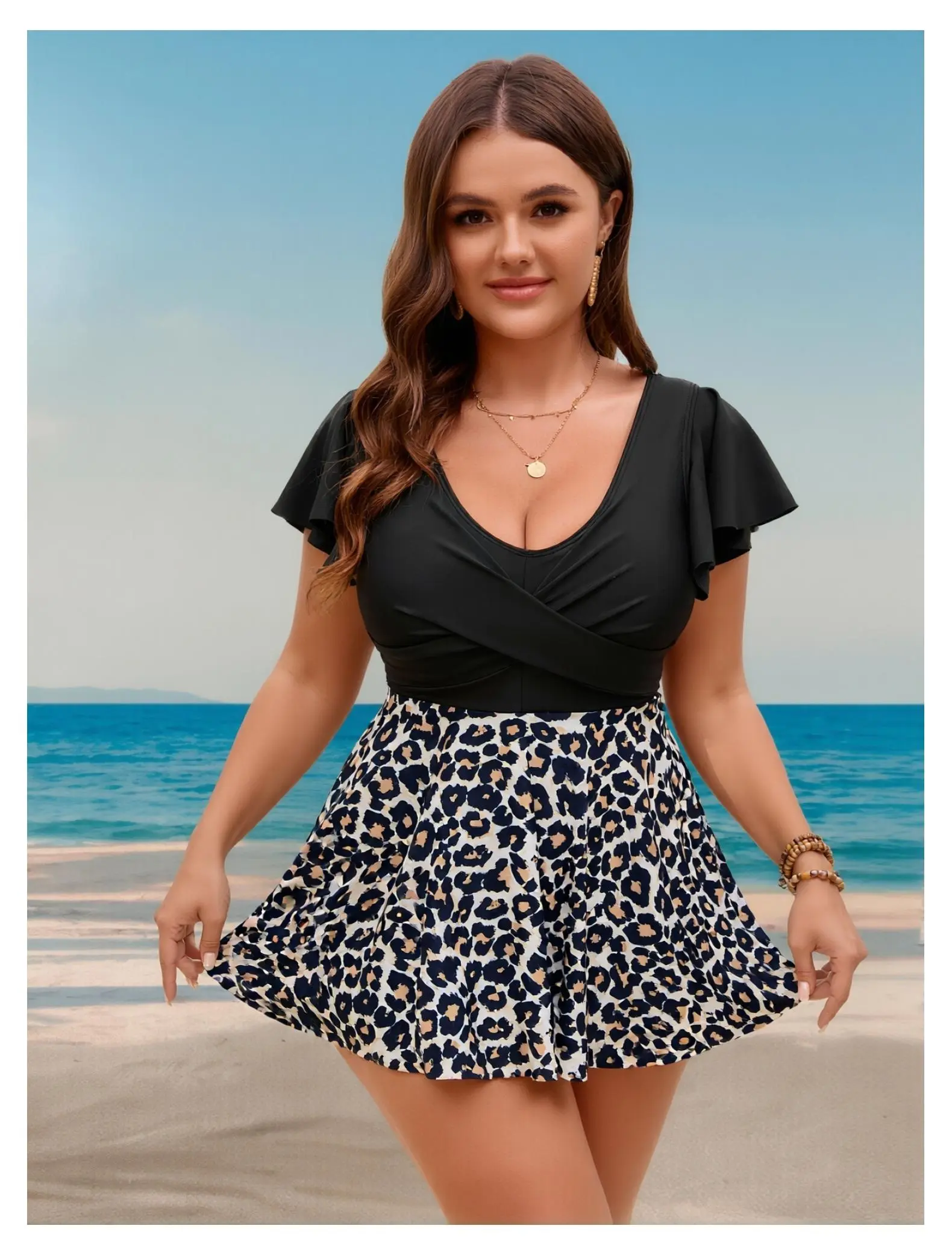 Plus Size Swimdress for Women V Neck Swimsuit with Flutter Sleeves, Leopard Print Color Block, Tummy Control Bathing Suit, Modest Swimwear for Beach, Pool, 12-24W