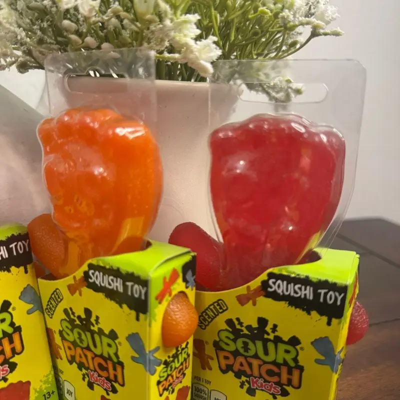 Official Sour Patch Kids Scented Squishy Toy. Smells just like the real candy! Super soft, squeezable and stretchy. Satisfying stress relief fidget toy. Perfect gift for kids, teens and candy lovers. Comes in assorted colors. Ships fast.