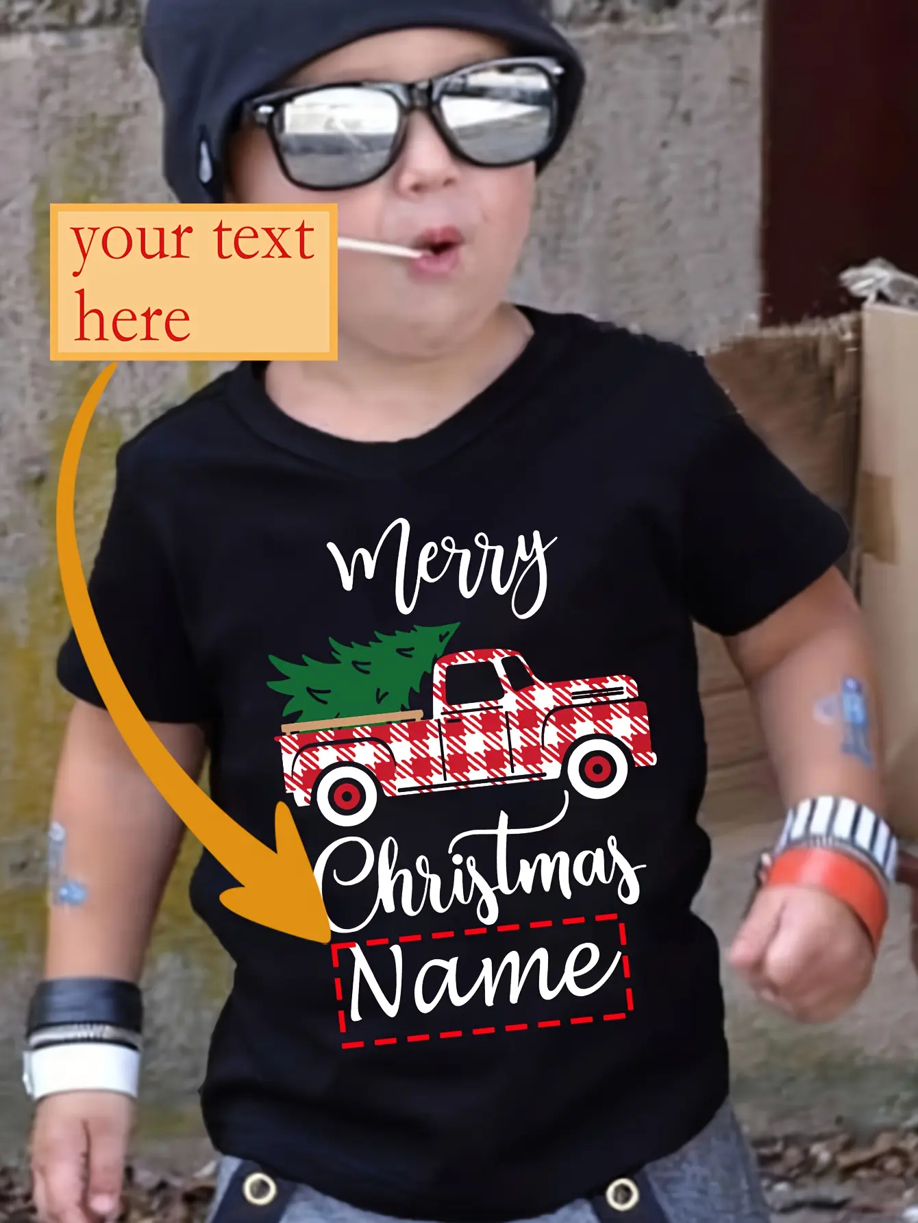 Christmas Boy's T-shirt Name Customization Christmas Happy Letter Christmas Tree and Truck Pattern Printing Trendy Comfortable Round Neck Short Sleeve Top (3-13Y)