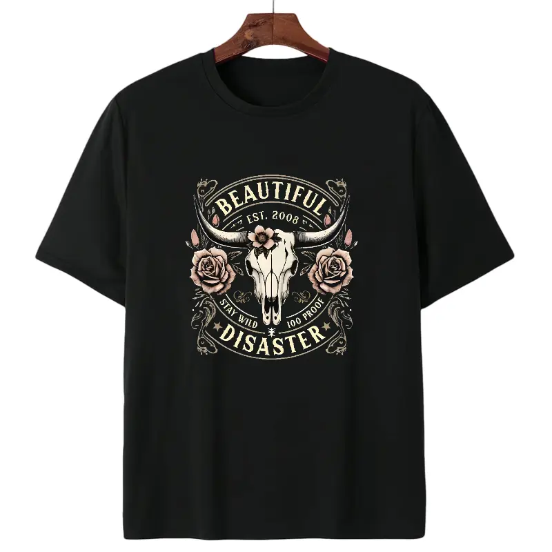 Women's Western Cowboy Graphic T-Shirt - Black Short Sleeve Crew Neck Top with Bull Skull & Floral Design, "" Vintage 2008 Text, Casual Spring/Summer Tee for Outdoor & Casual AttireWomen's Western Cowboy Graphic T-Shirt - Black Short Sleeve Crew Neck Top with Bull Skull & Floral Design, "" Vintage 2008 Text, Casual Spring/Summer Tee for Outdoor & Casual Attire