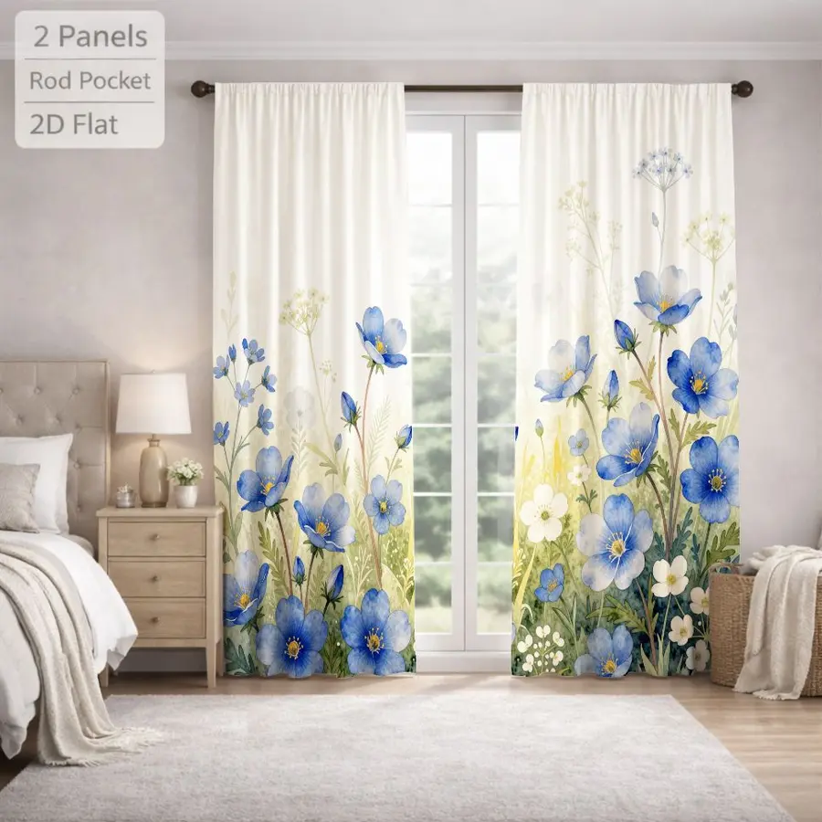 2Pcs Floral Rustic Blue Flower Meadow Sun Blocking Curtains Digital Printed Rod Pocket, Window Treatment For Bedroom Office Kitchen Living Room Study Home Decor