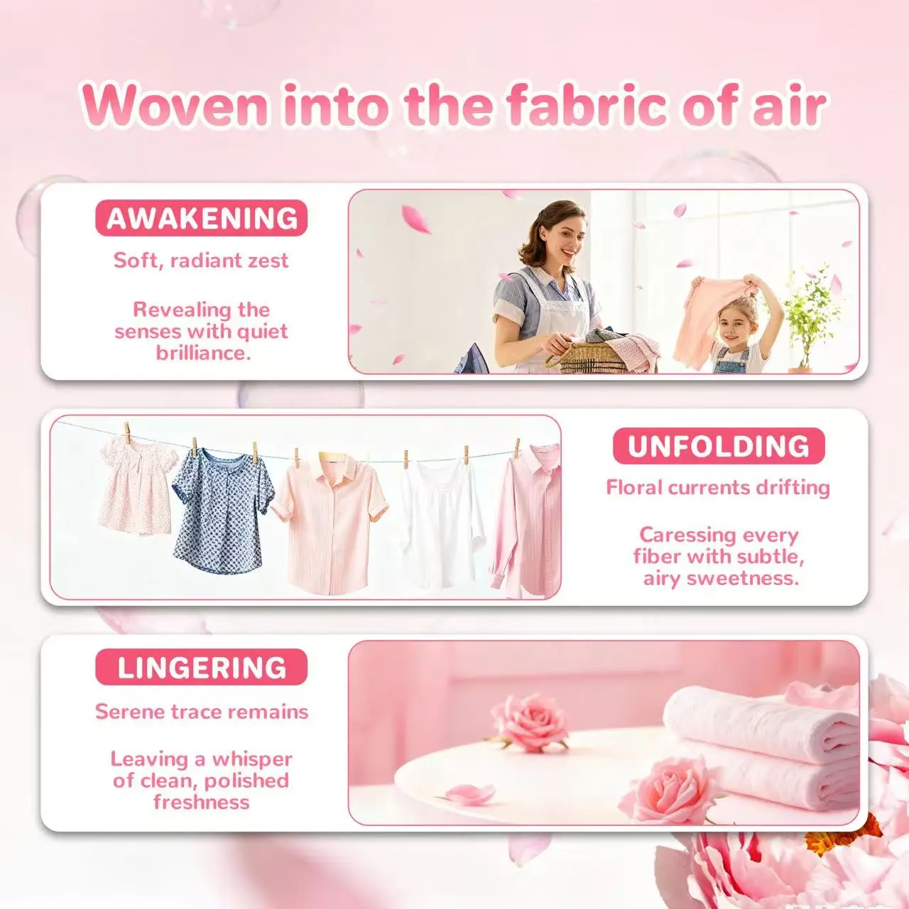 ·All-in-one care: deep cleaning + color protection + anti-wrinkle + fabric softening + fast dissolve + long-lasting freshness + anti-graying.