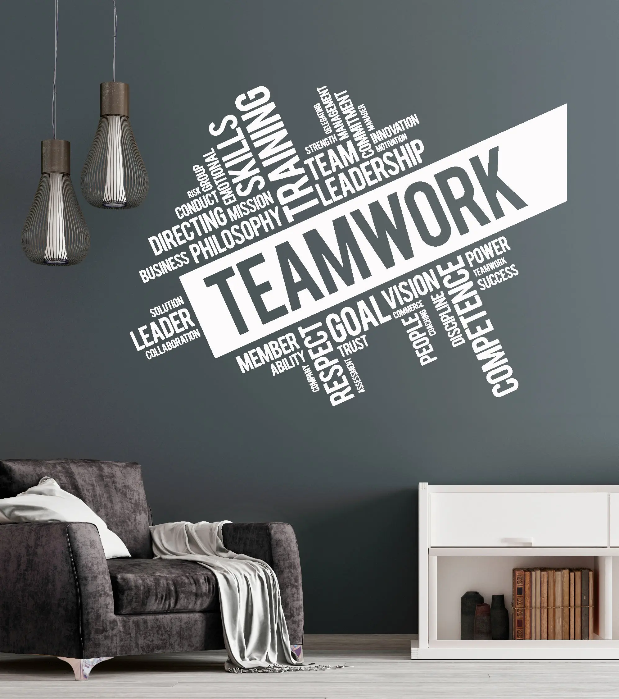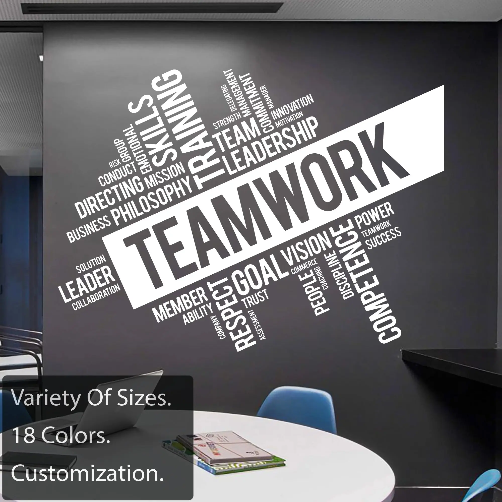 Foster teamwork in your office with our Teamwork Wall Decal. High-quality, easy application for a collaborative atmosphere. Redefine your workspace with motivating designs, creating a visually inspiring ambiance that encourages synergy. Elevate your office decor with a touch of unity today!